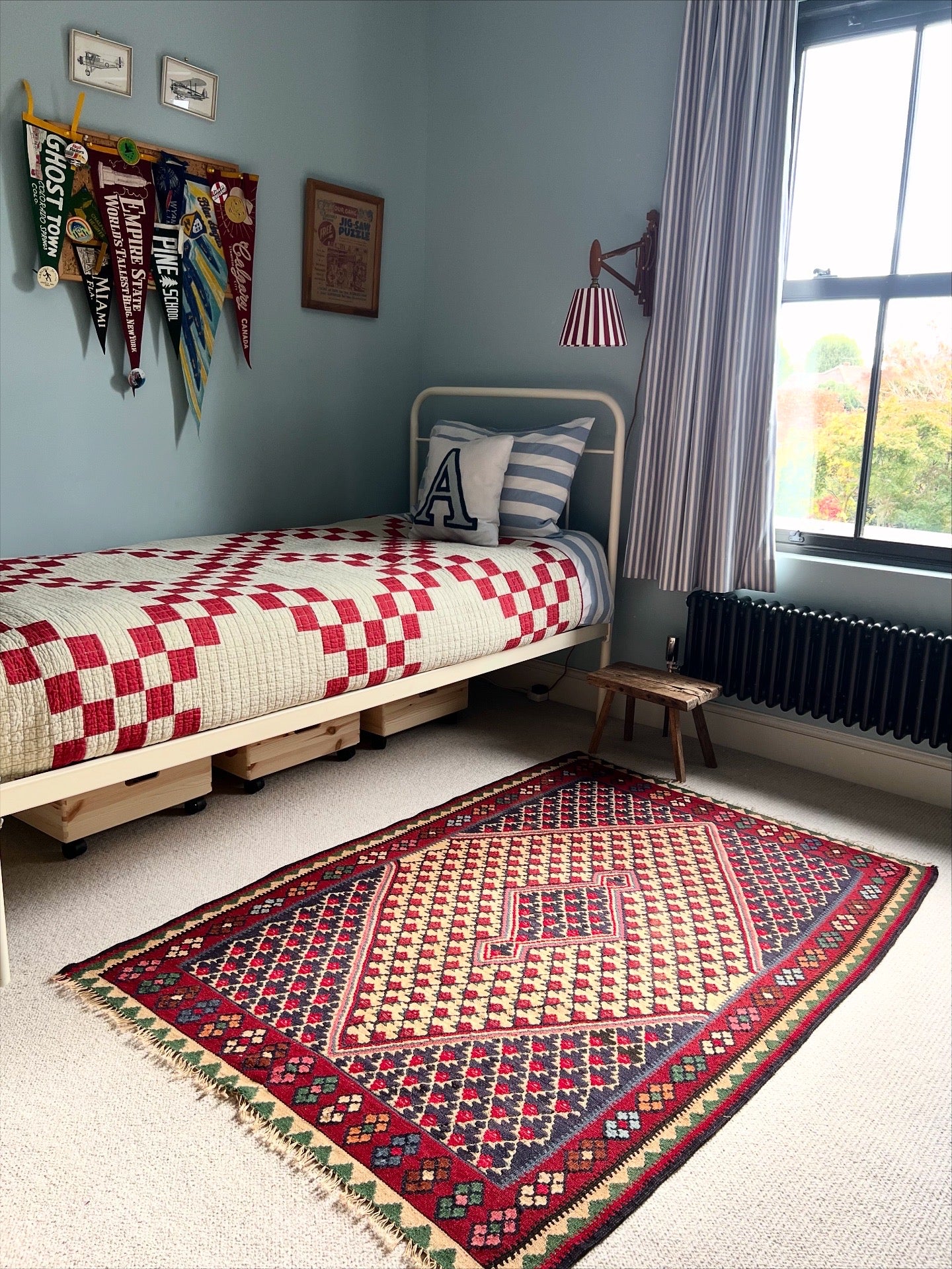 It has the classic Senneh diamond medallion surrounded by rows of teeny floral motifs, all in those dreamy colours, deep navy, soft cream, madder red, and hints of green.