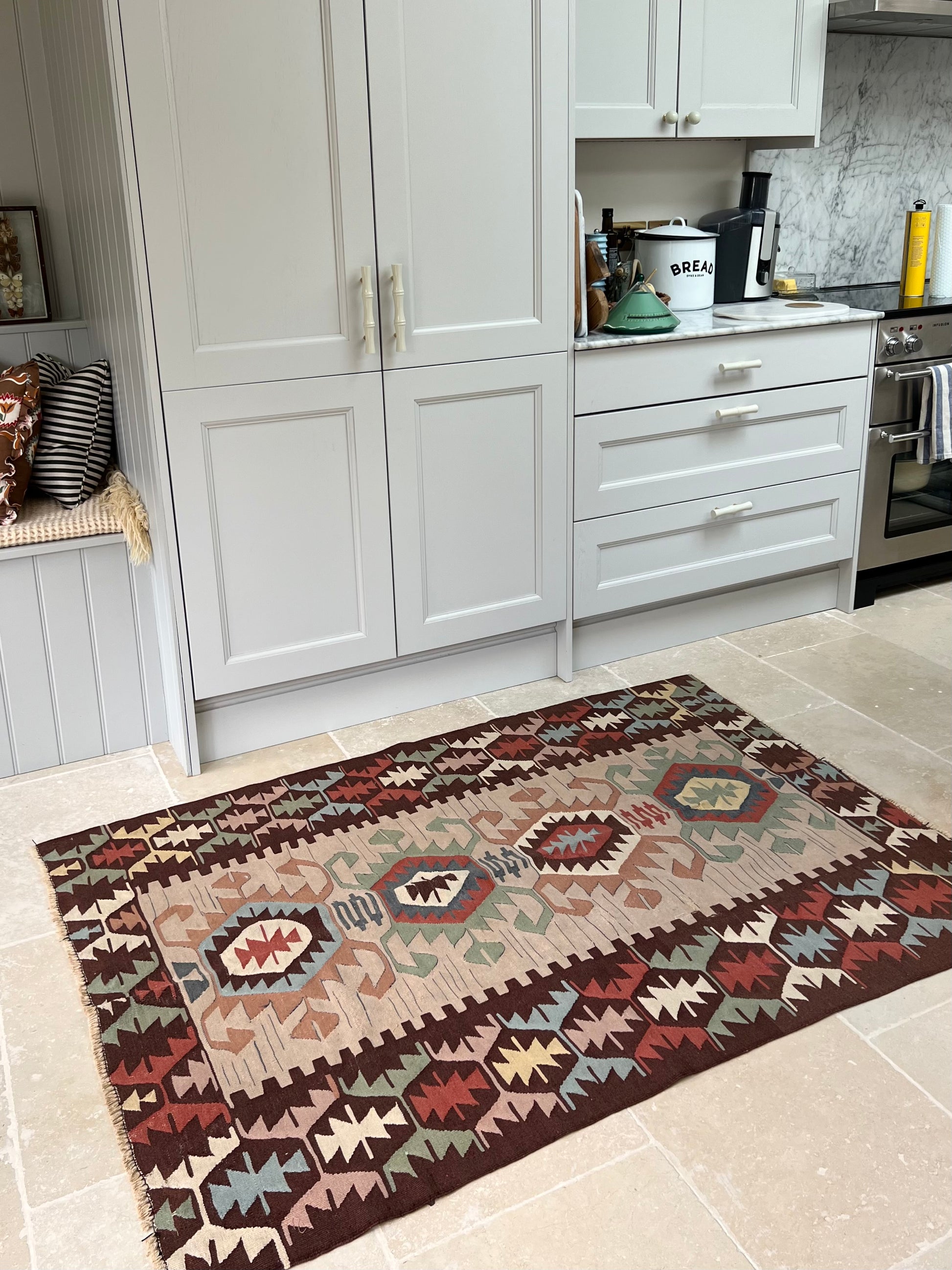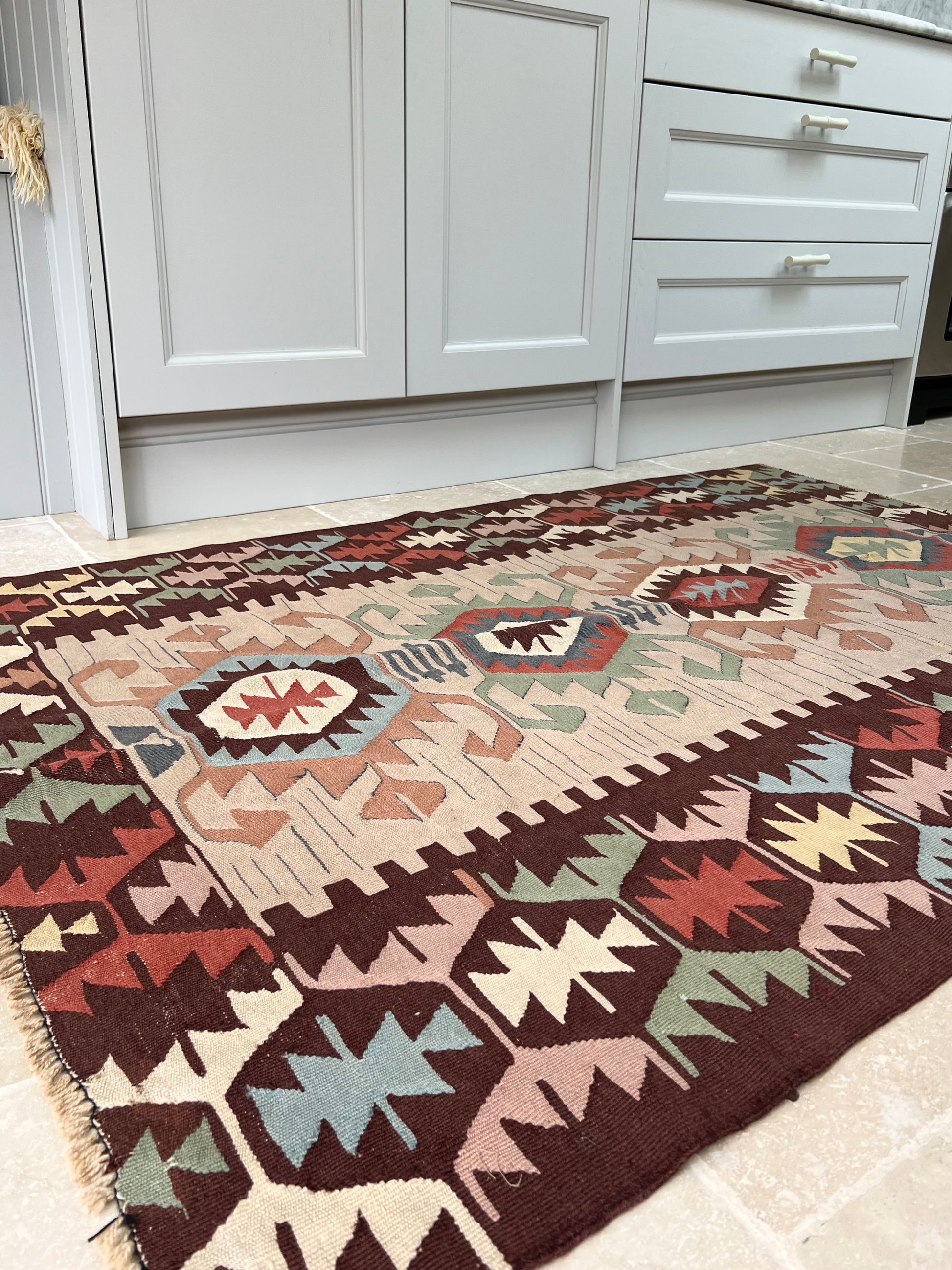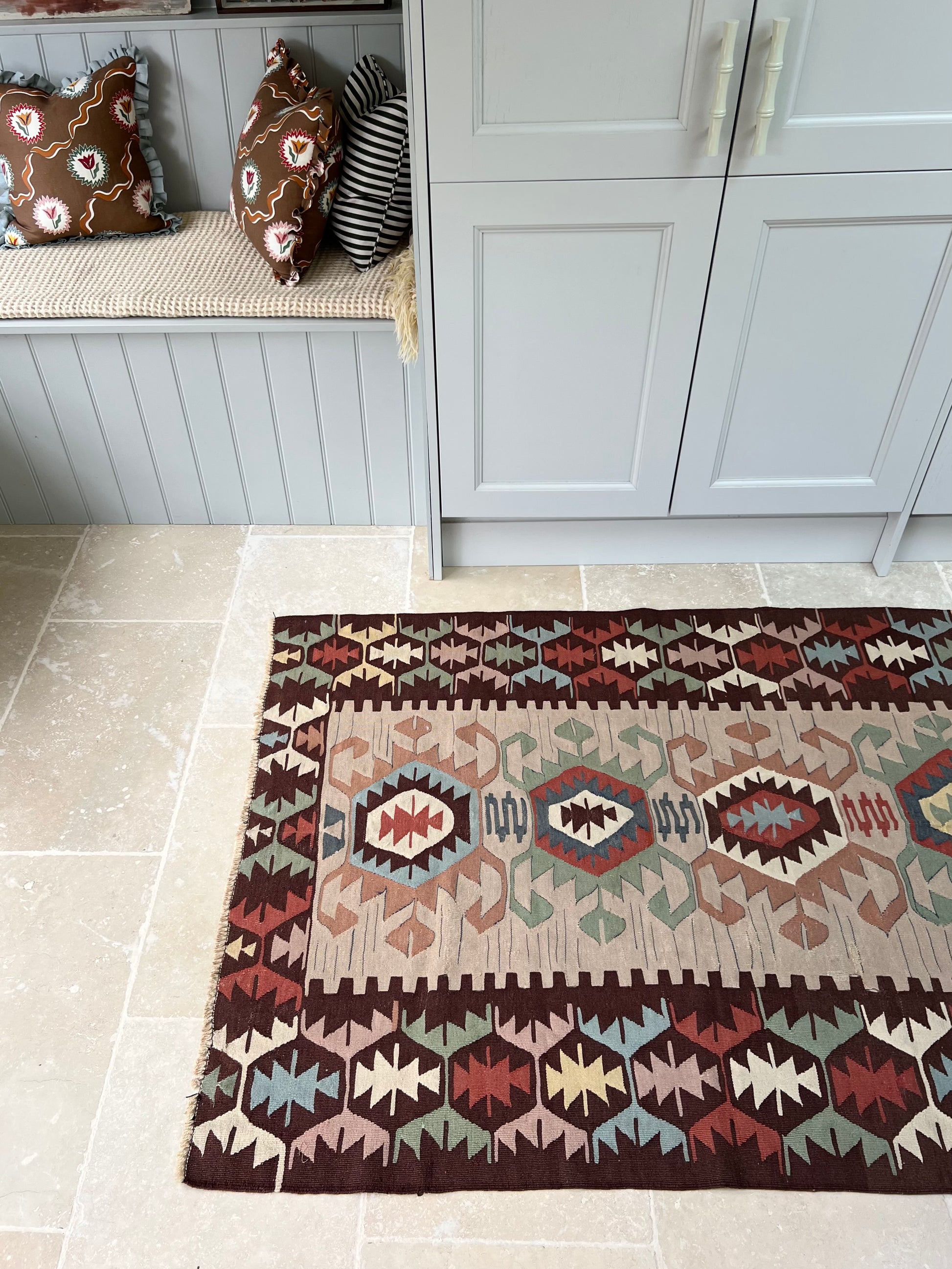 This bold flatweave is all about contrast and rhythm. Beautifully balanced with warm rust, inky brown, sage, and dusty blue jostle together in a kaleidoscope of geometric motifs. Set off with pops of yellow lemon and raspberry.