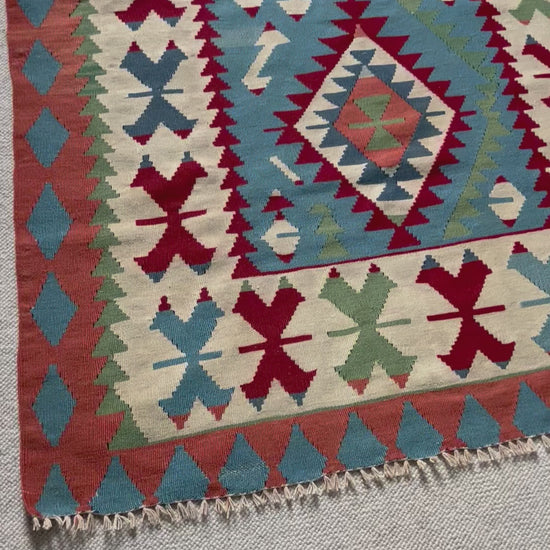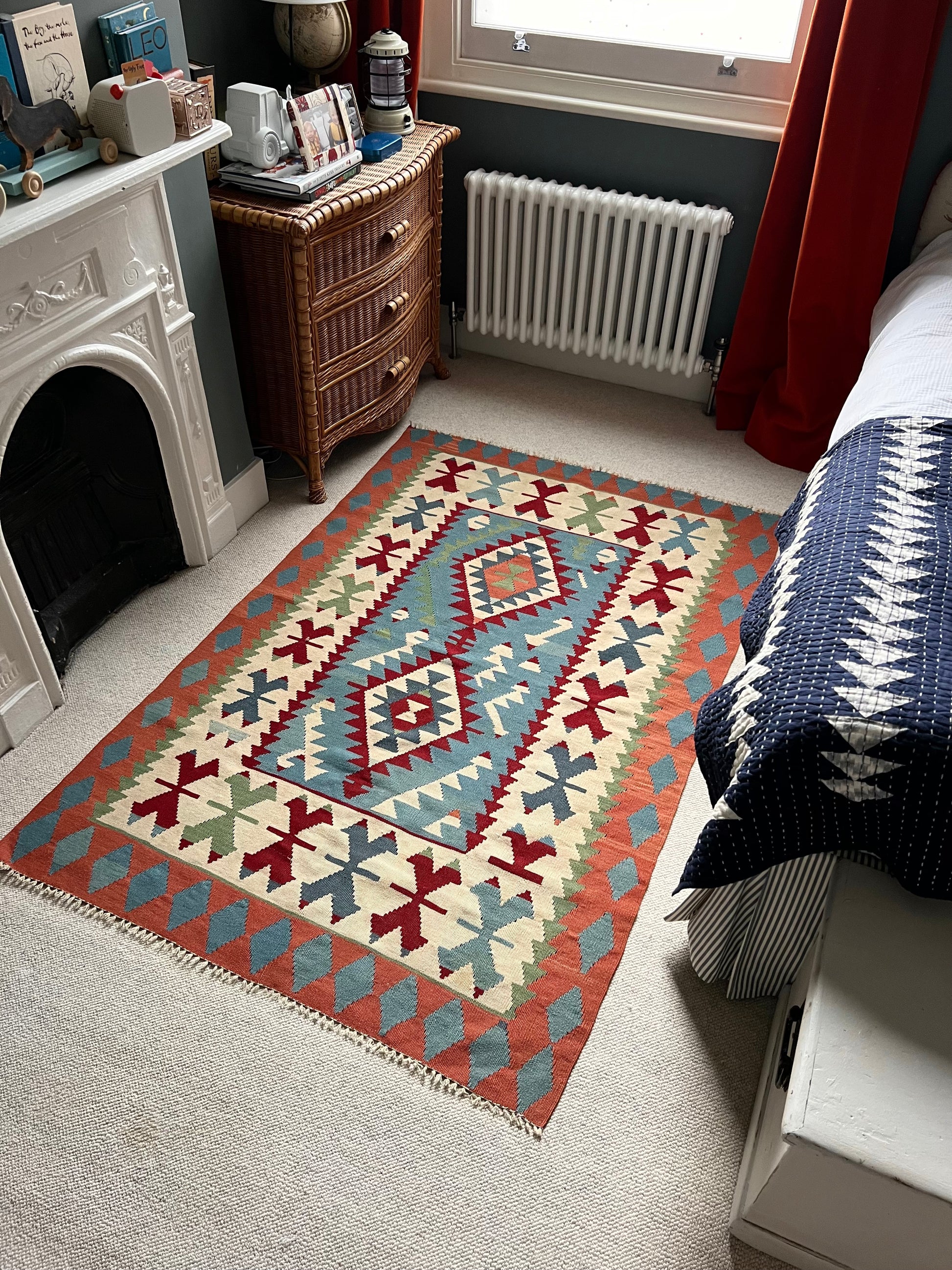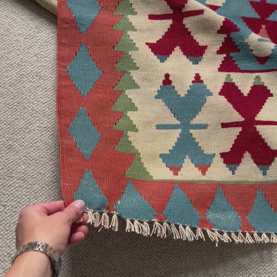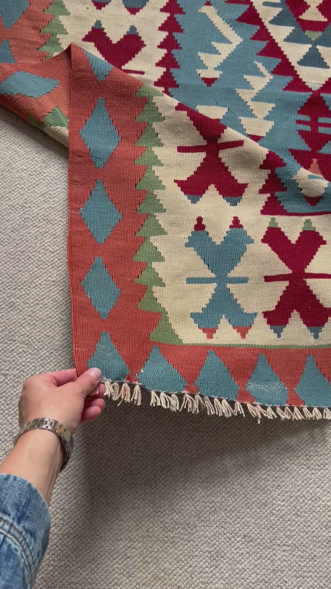 A fun and bright geometric flatweave Kilim with bold colours and delicate fringed edges.