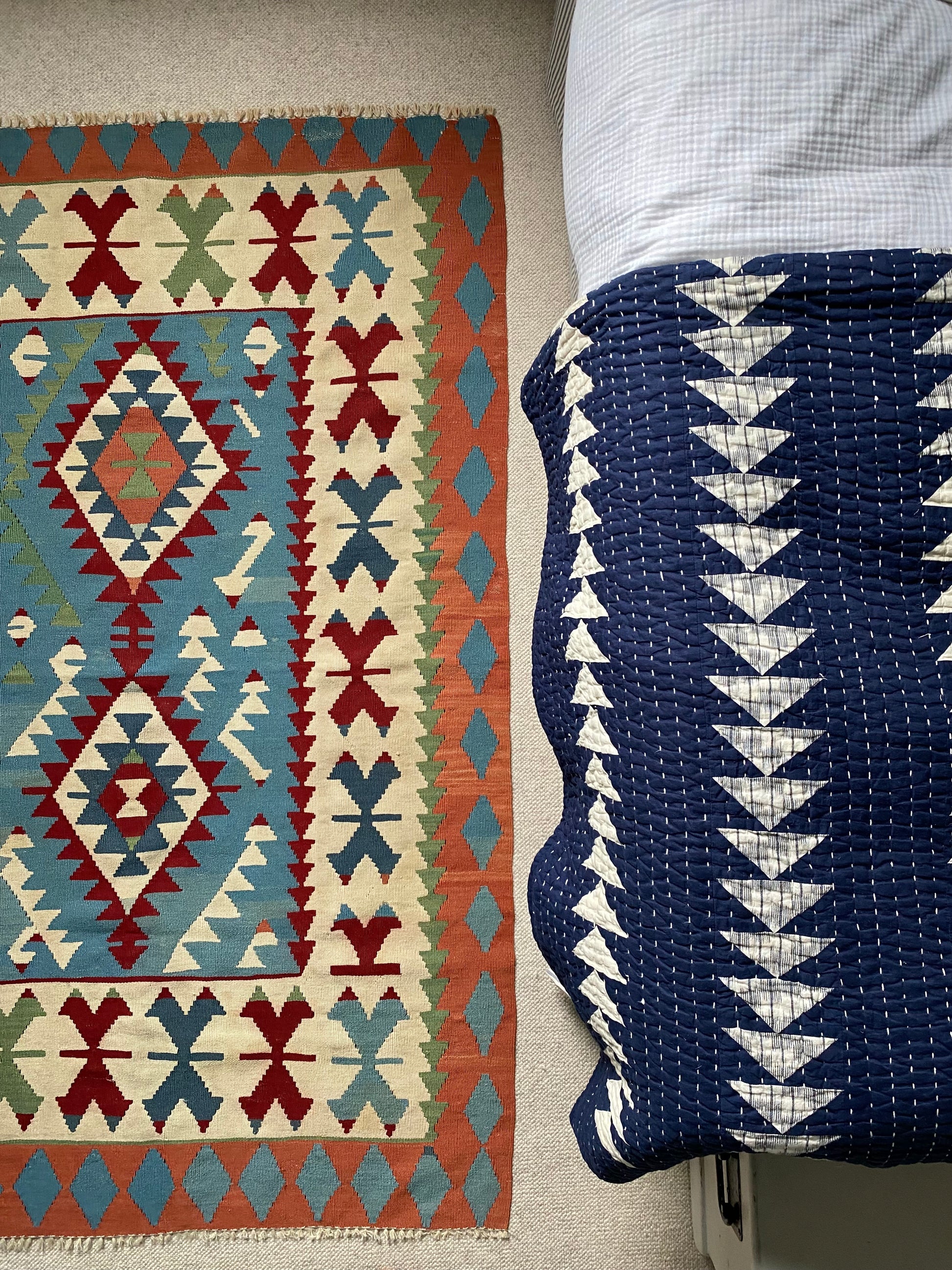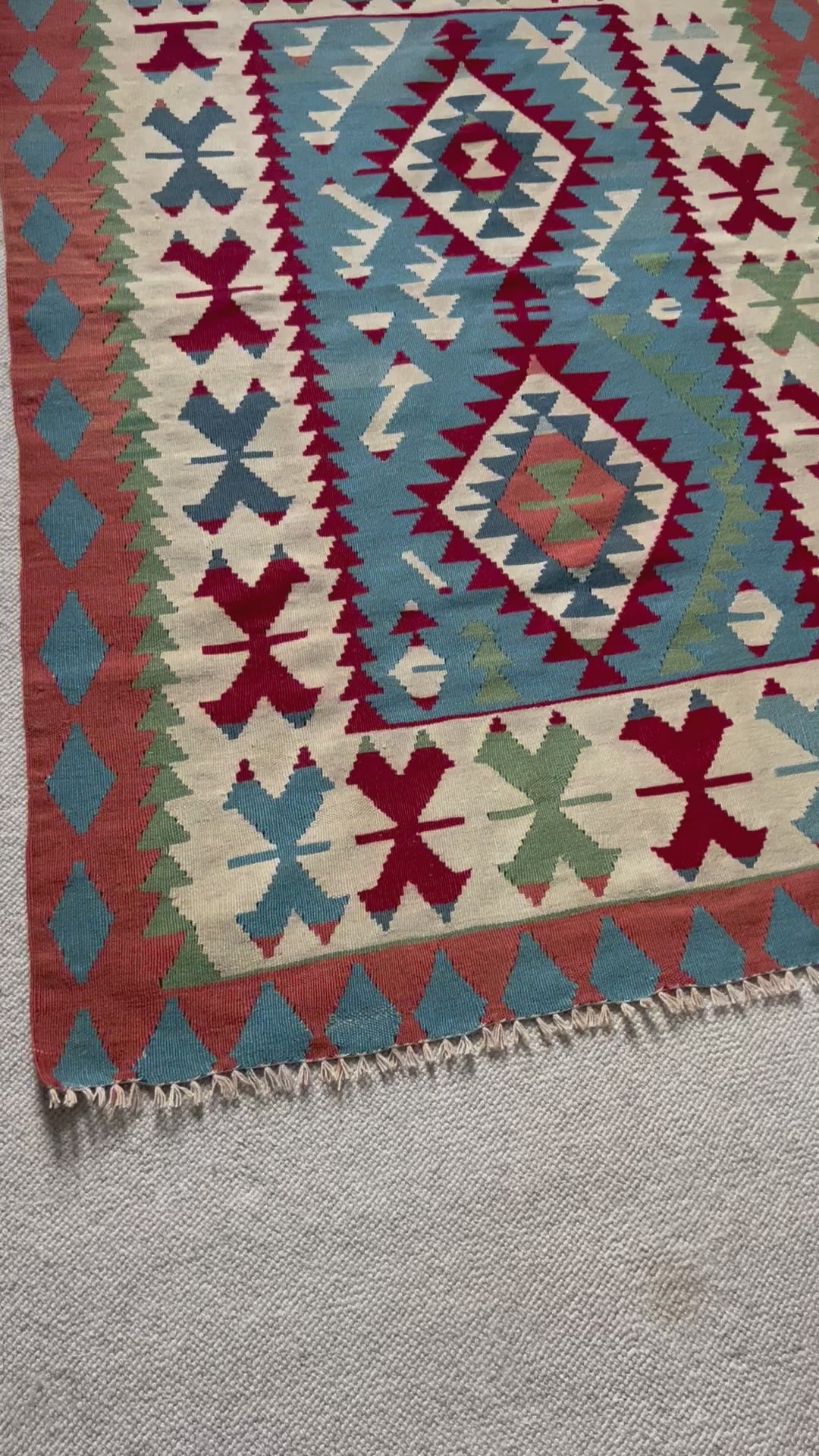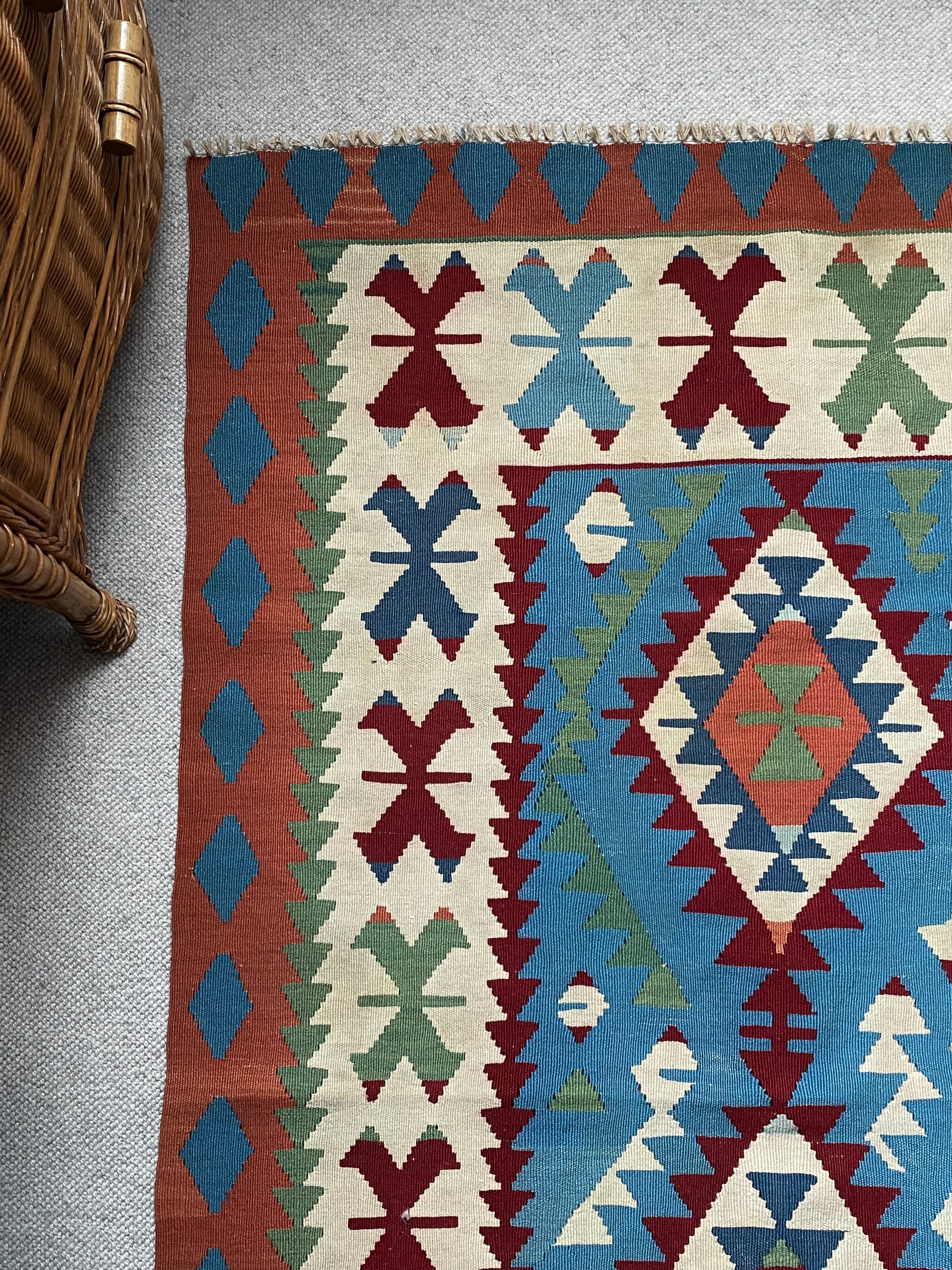 A fun and bright geometric flatweave Kilim with bold colours and delicate fringed edges.
