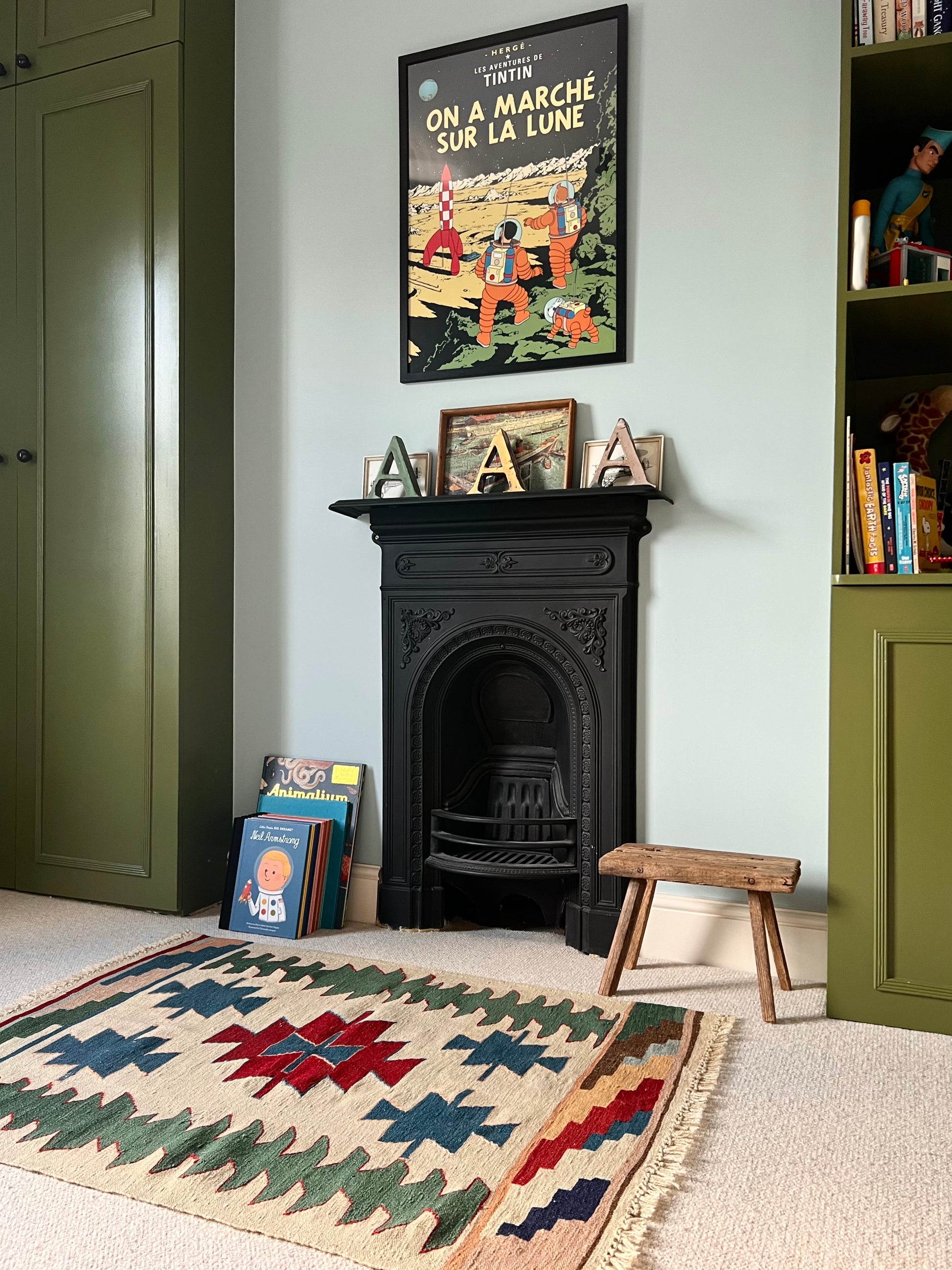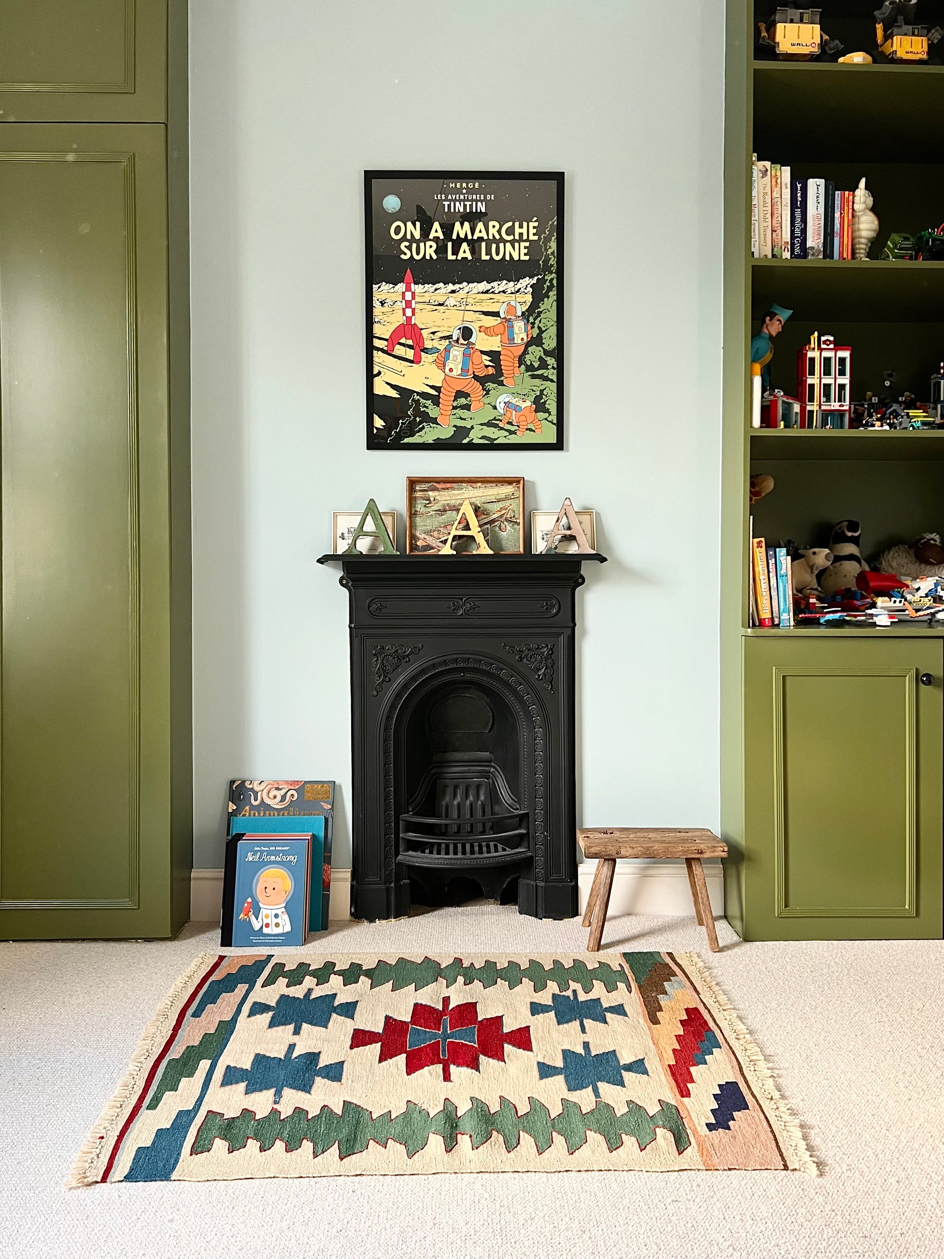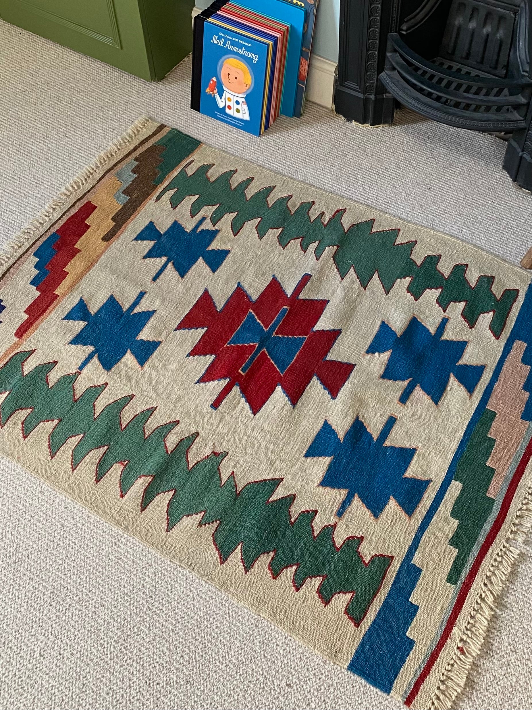 A bright bold, primary coloured rug, ideal for a child's bedroom.