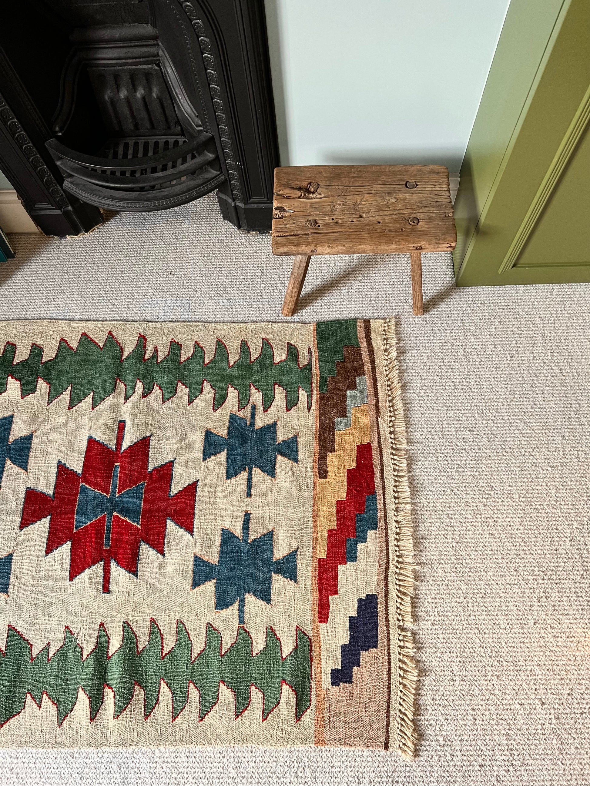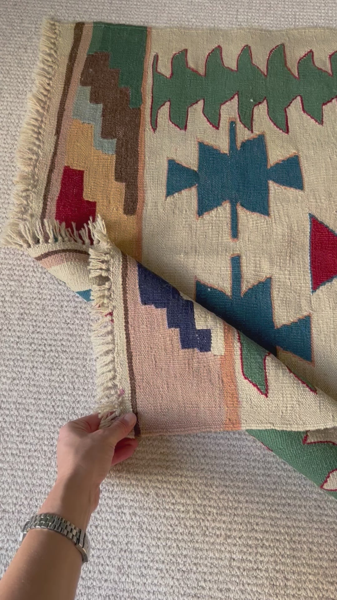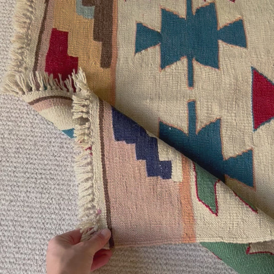 The sweetest size with azure blue, sage green, peach, and brick red patterns, on a creamy oat backdrop. The perfect piece to add some colour and interest, framing a fireplace, bed or chest of drawers, or even used as a wall hanging.