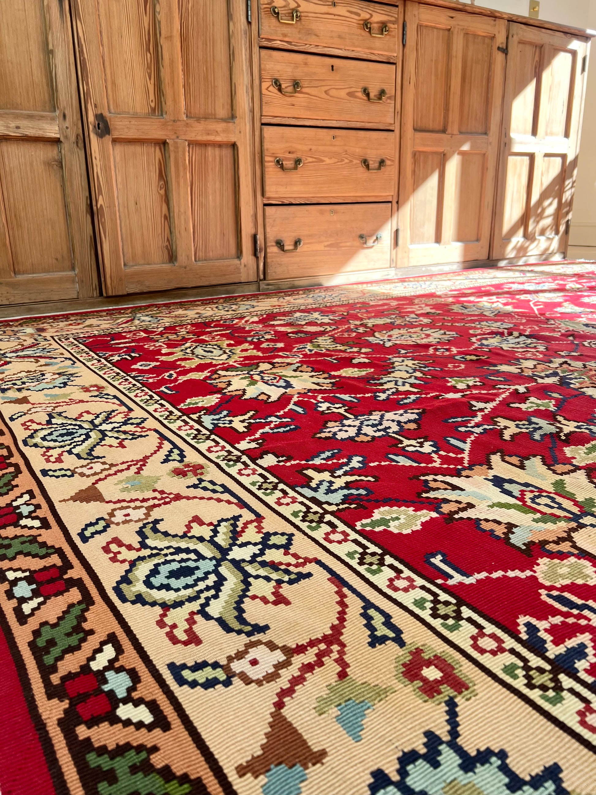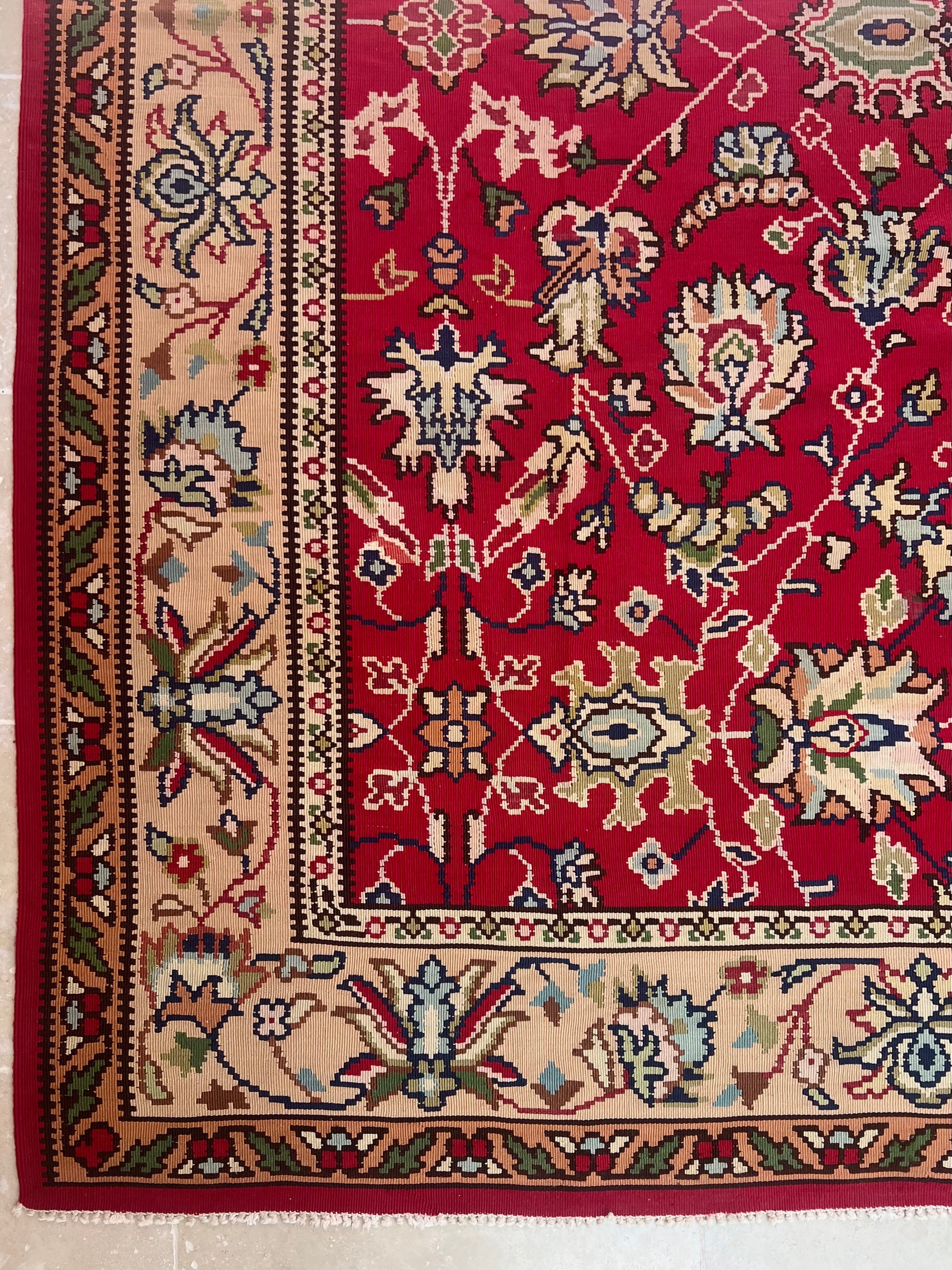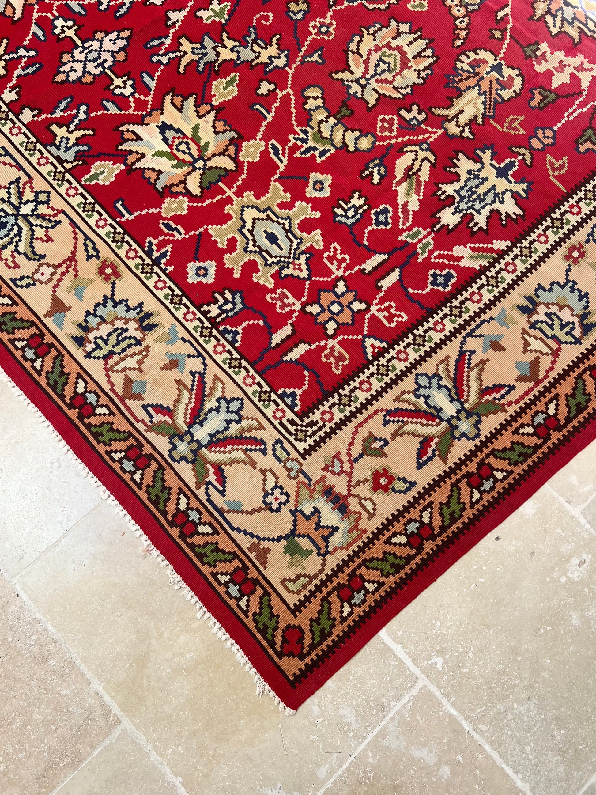 This grand Persian-style rug, woven in the mid-to-late 20th century, showcases the artistry of traditional carpet weaving with its rich red field, scrolling floral motifs, and elegant cream border.