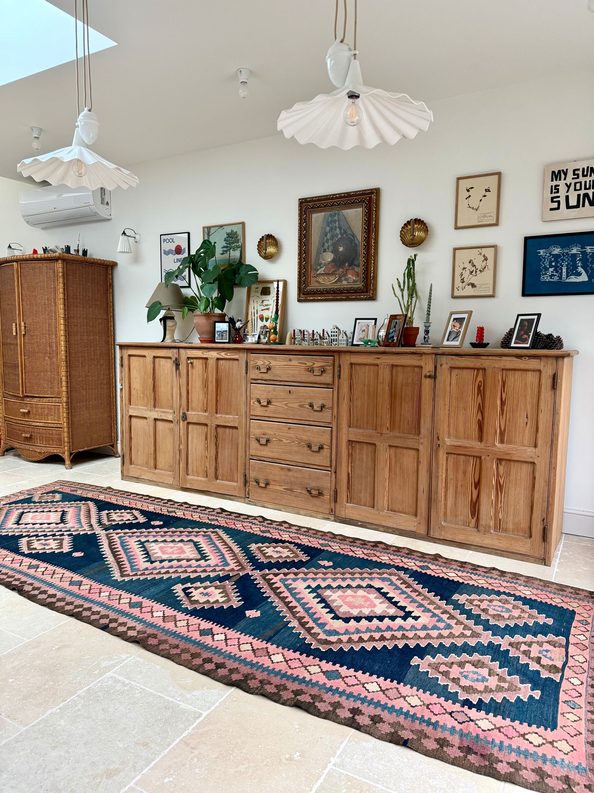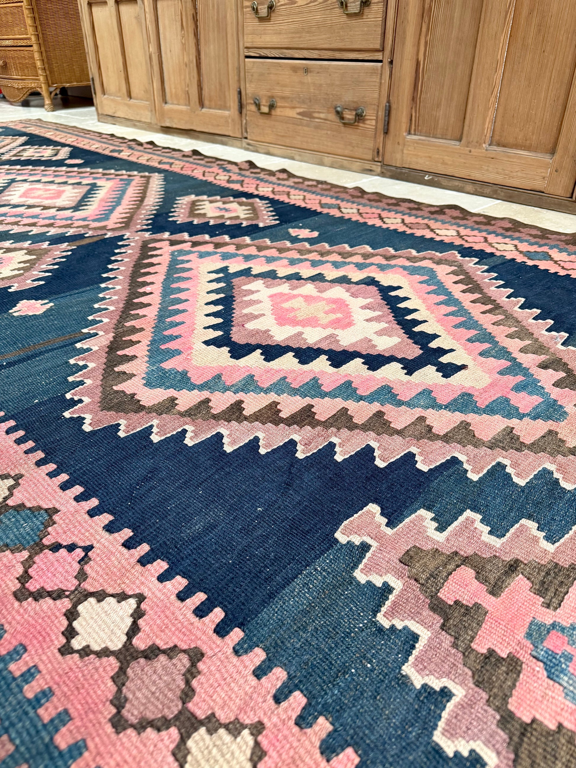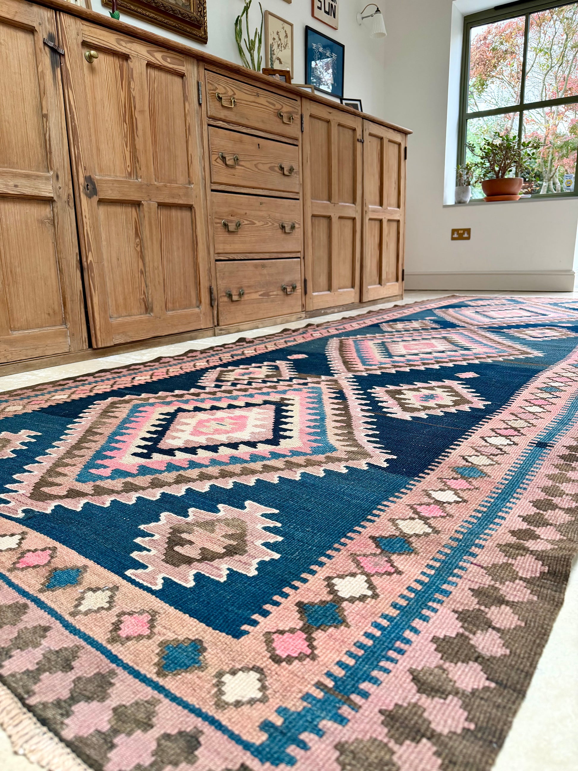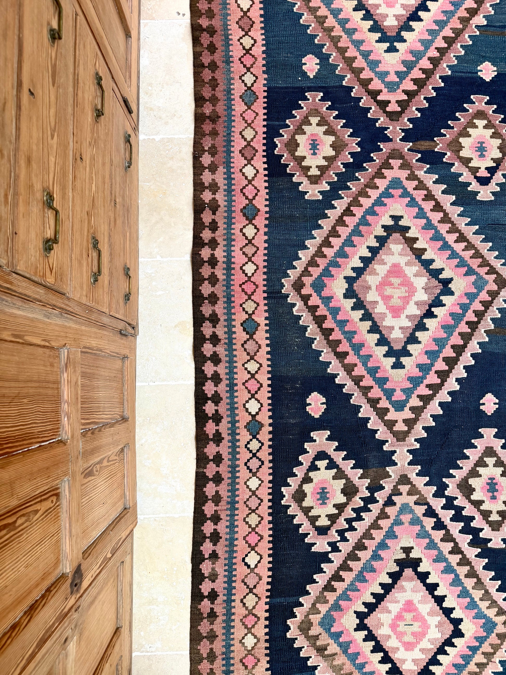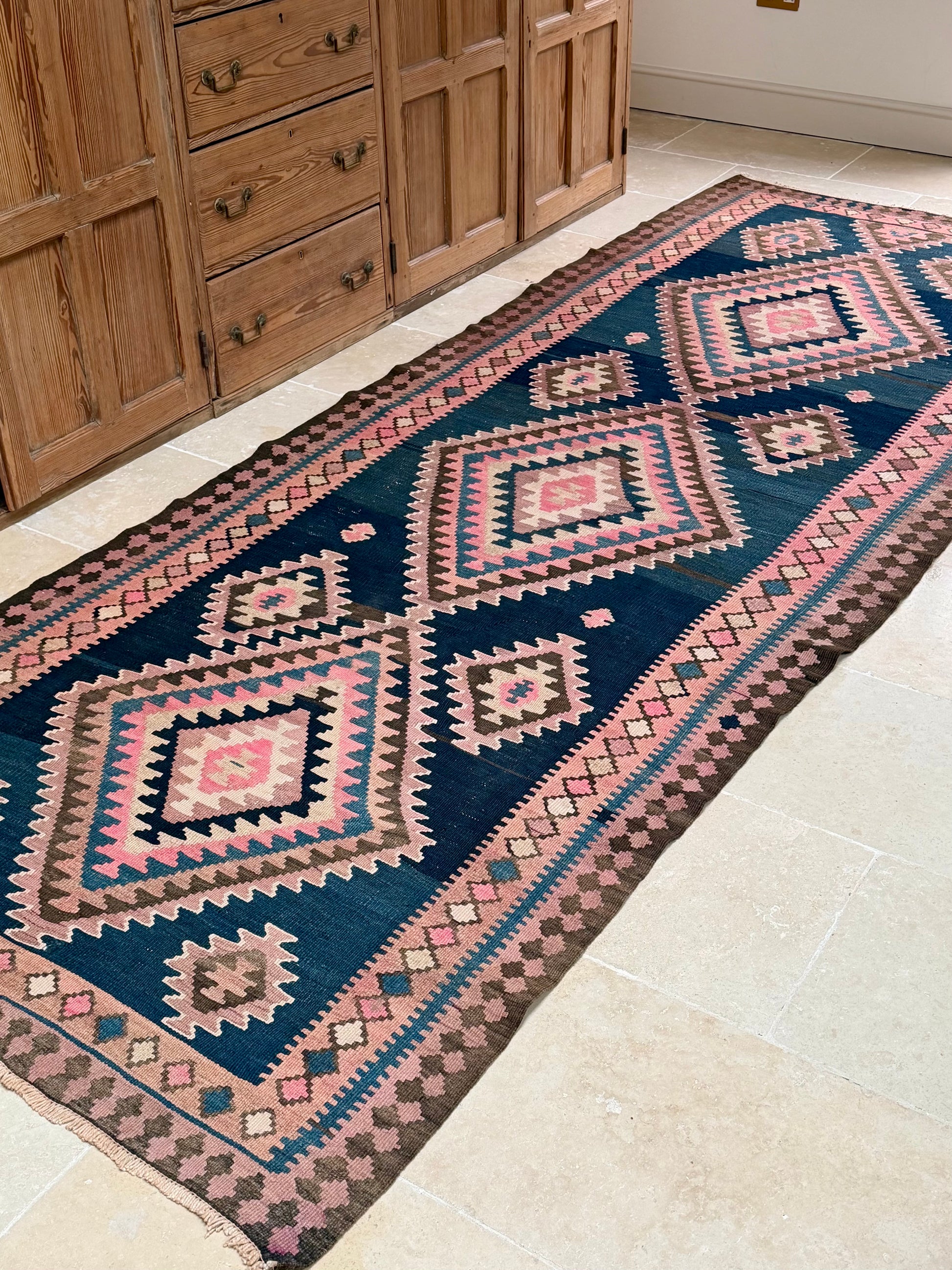Showcasing intricate diamond and zigzag patterns in rich navy, blush pink, and earthy brown — a striking blend of folk artistry and timeless warmth. This piece is perfect for a large hallway, or underneath a dining table to create a warm inviting feel.