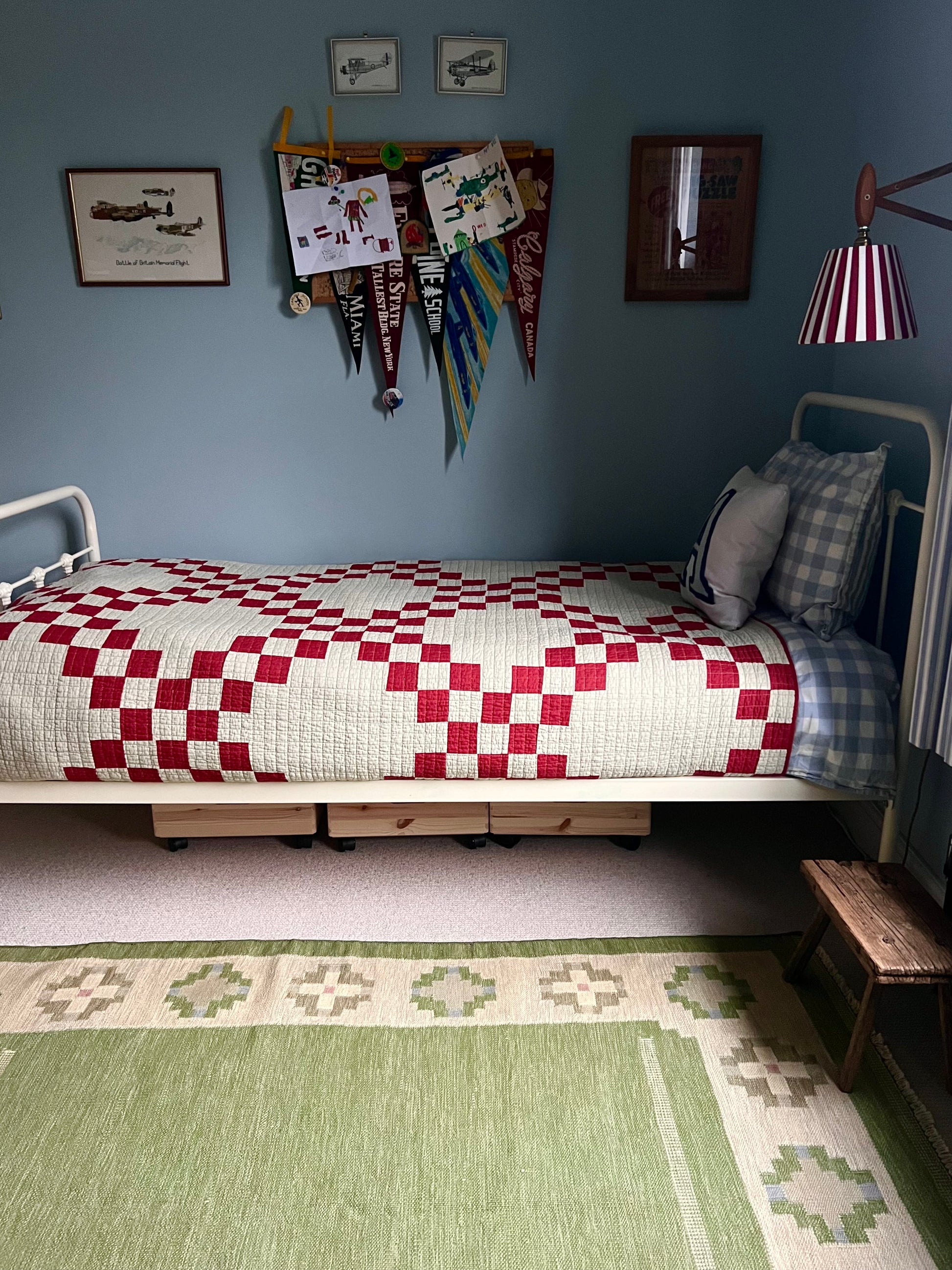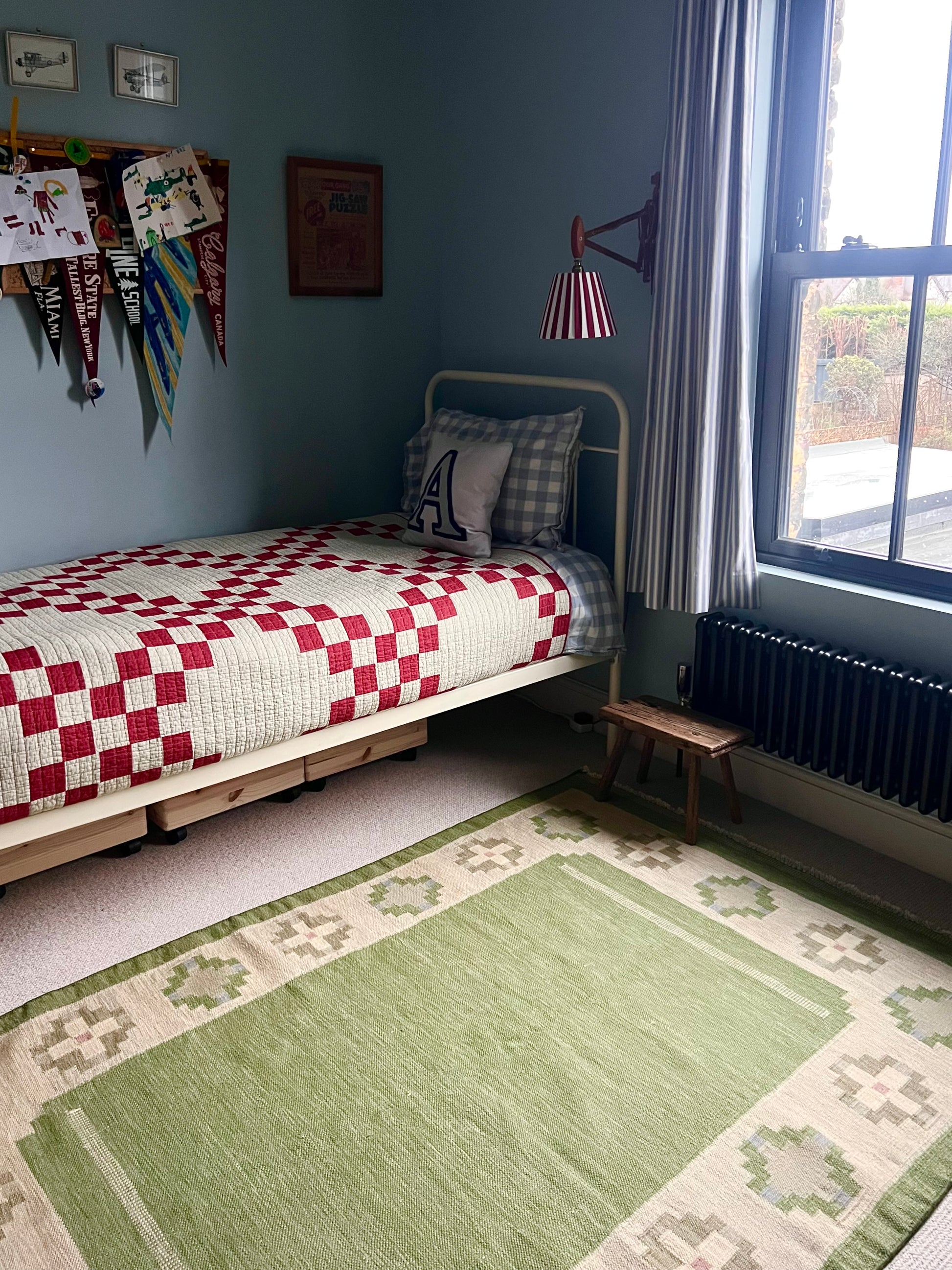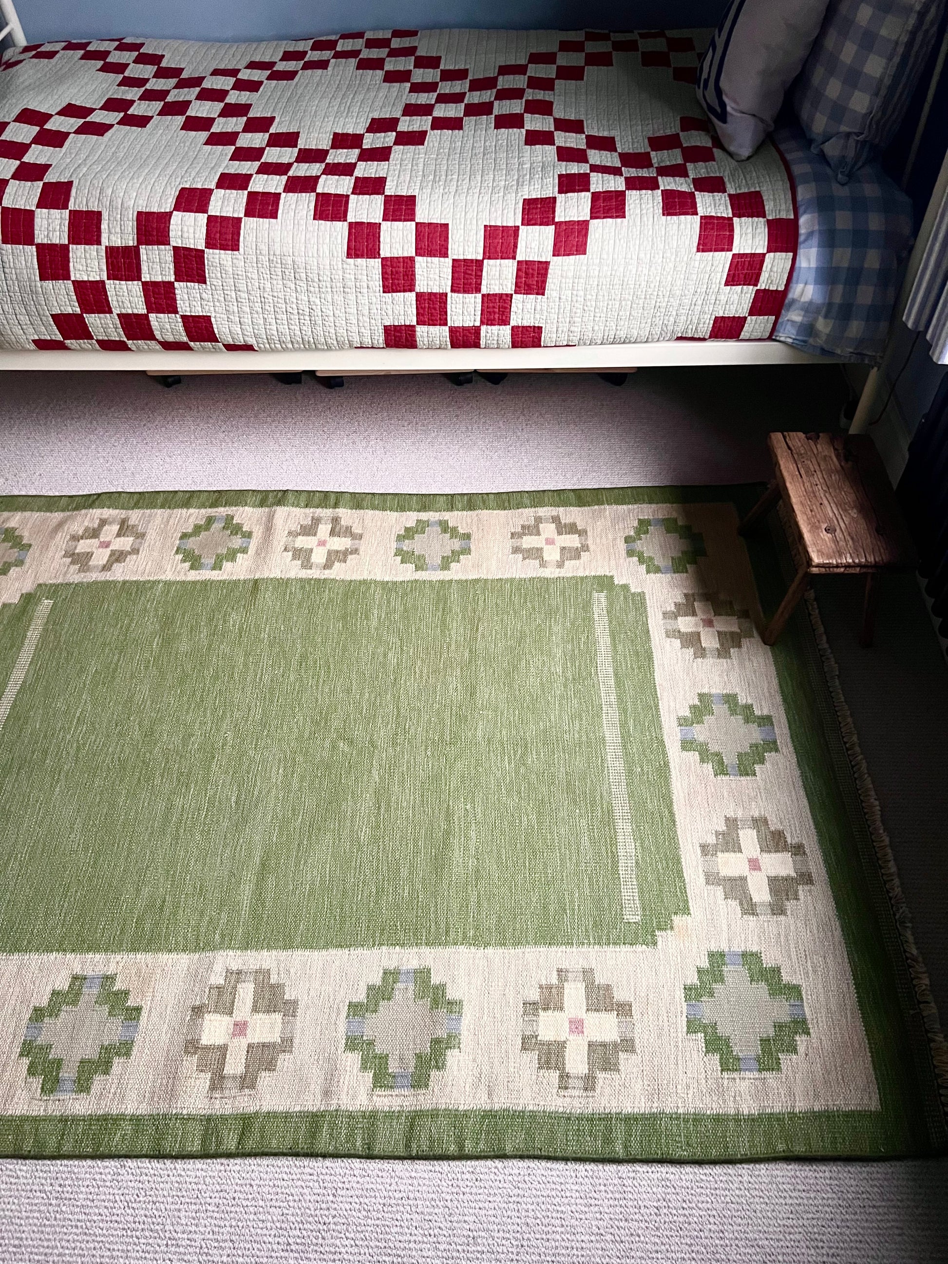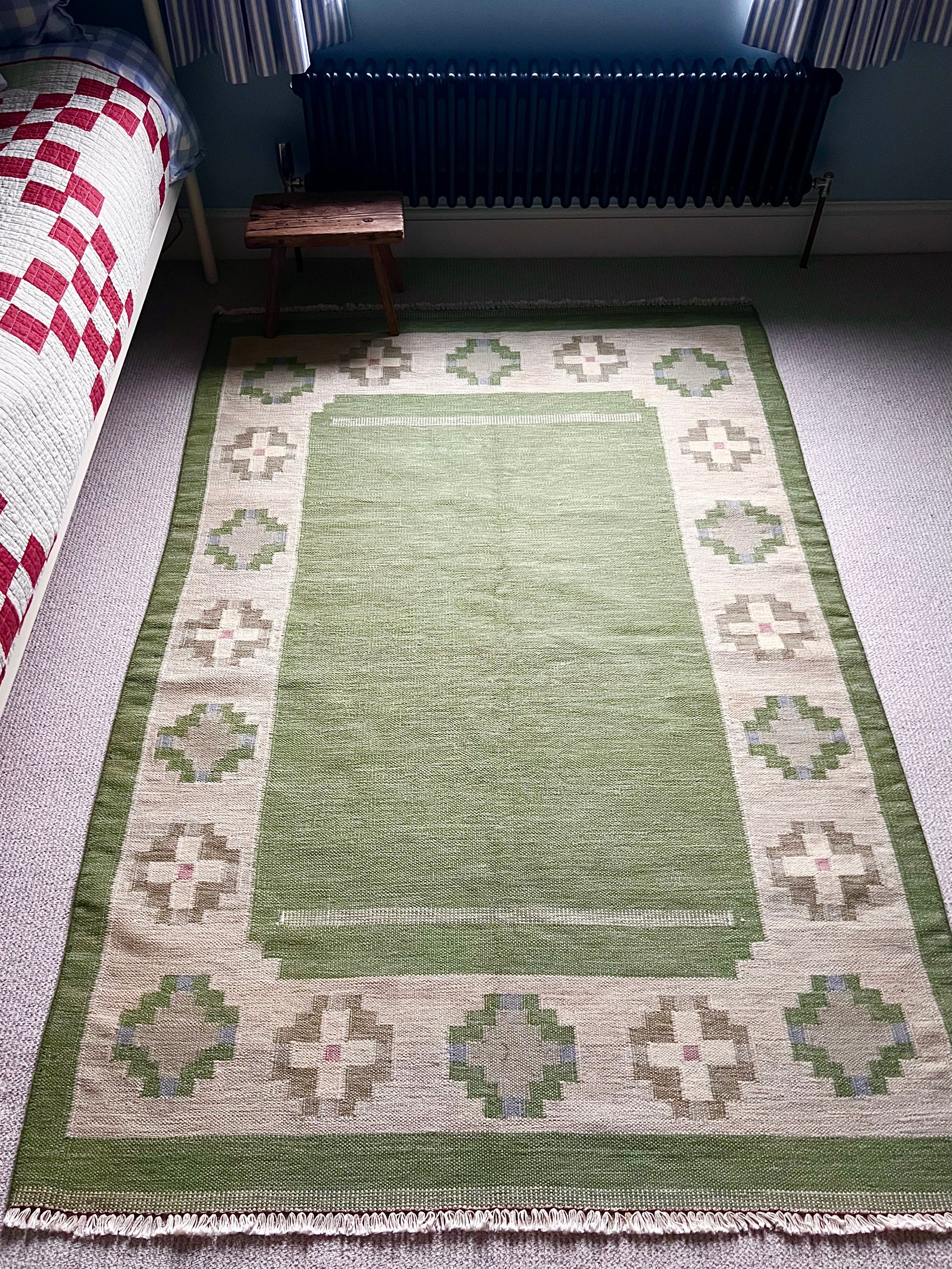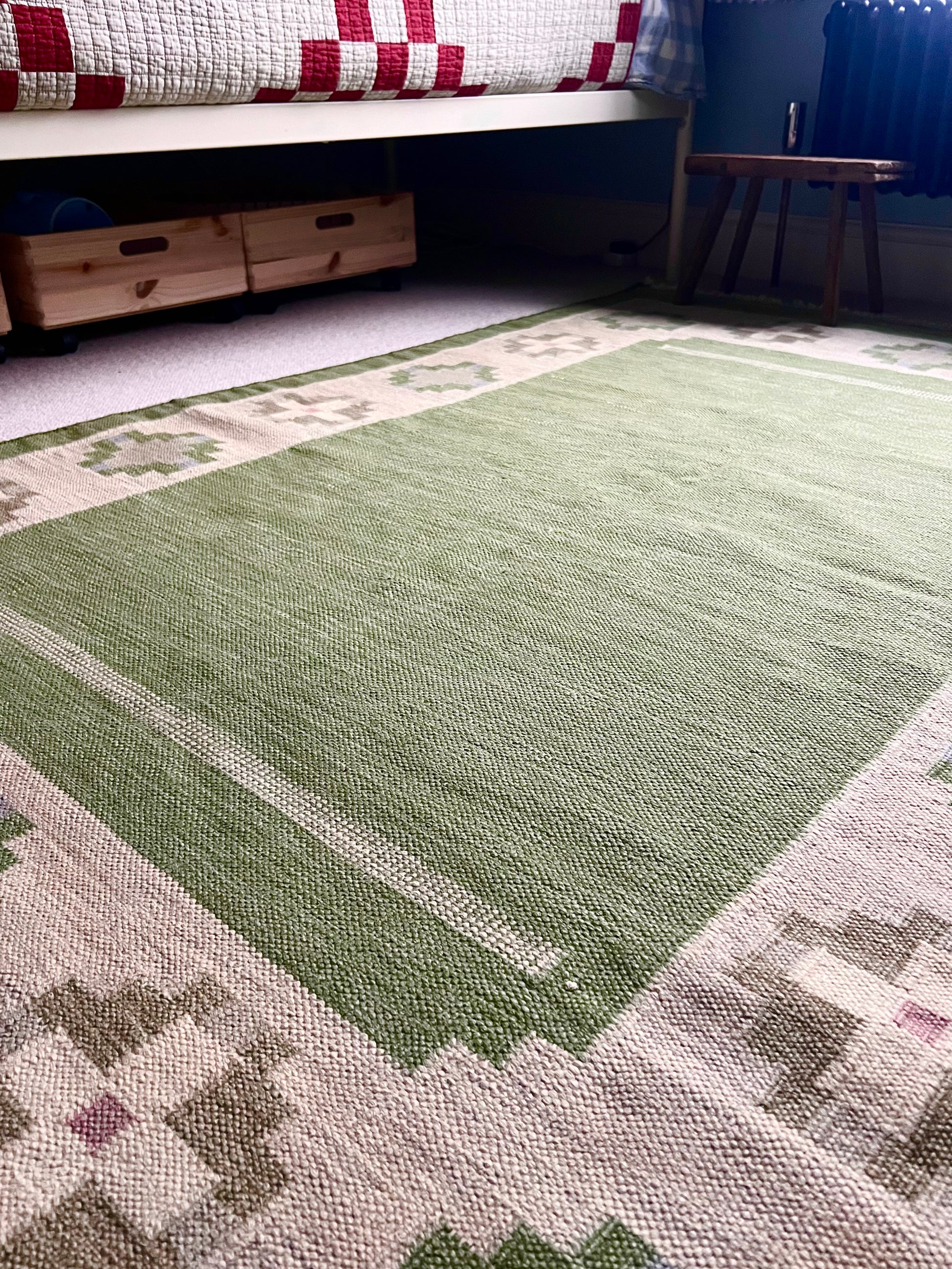 A vintage Swedish flatweave in the best pistachio greens, featuring bold geometric shapes.