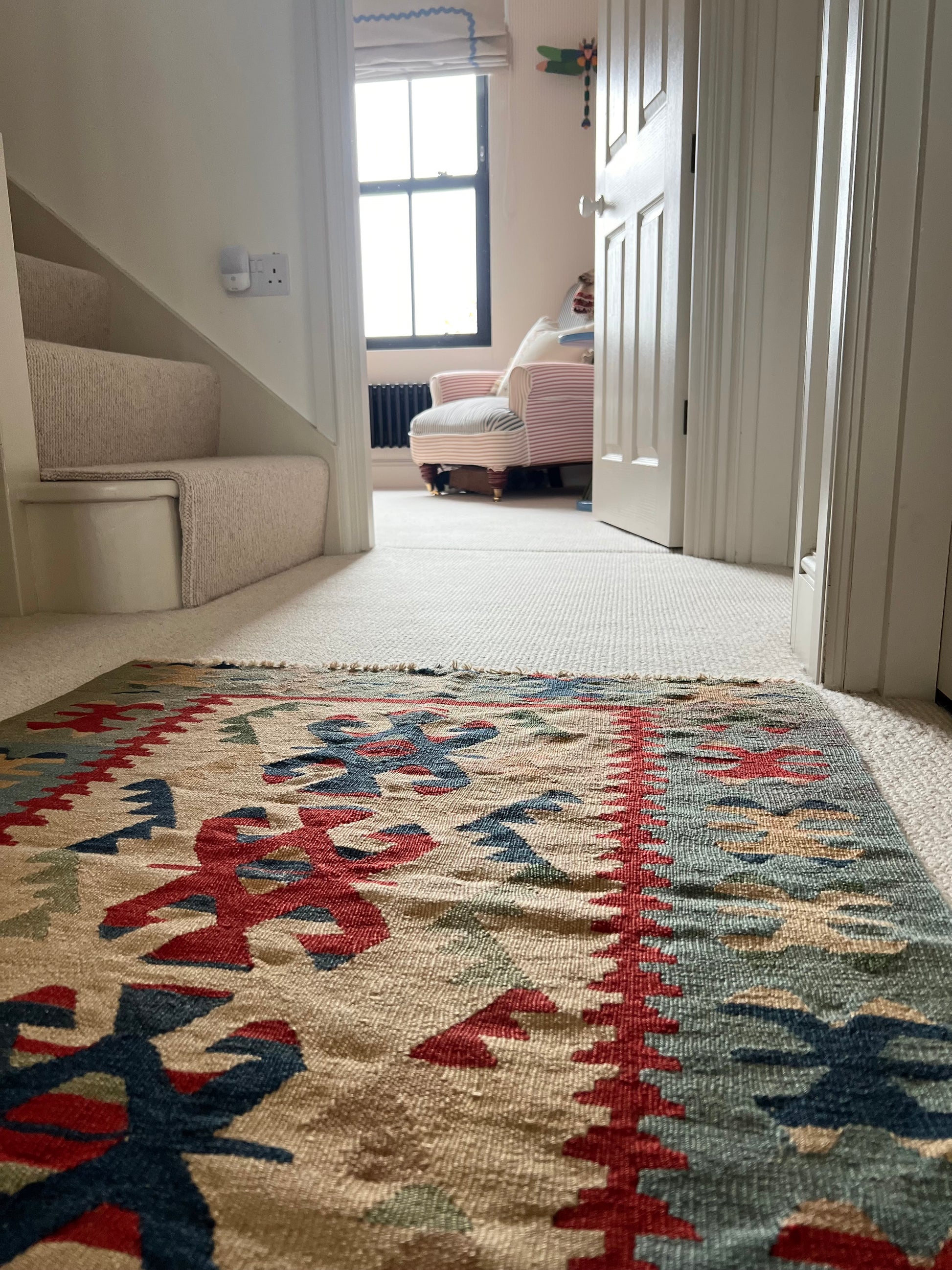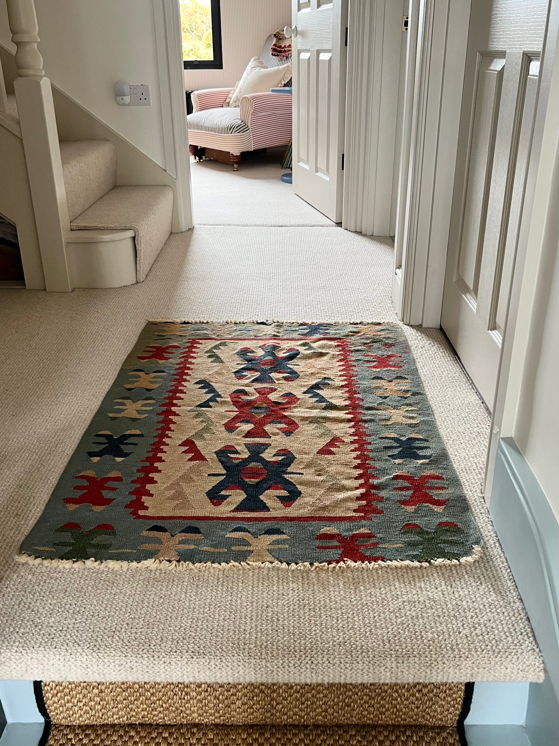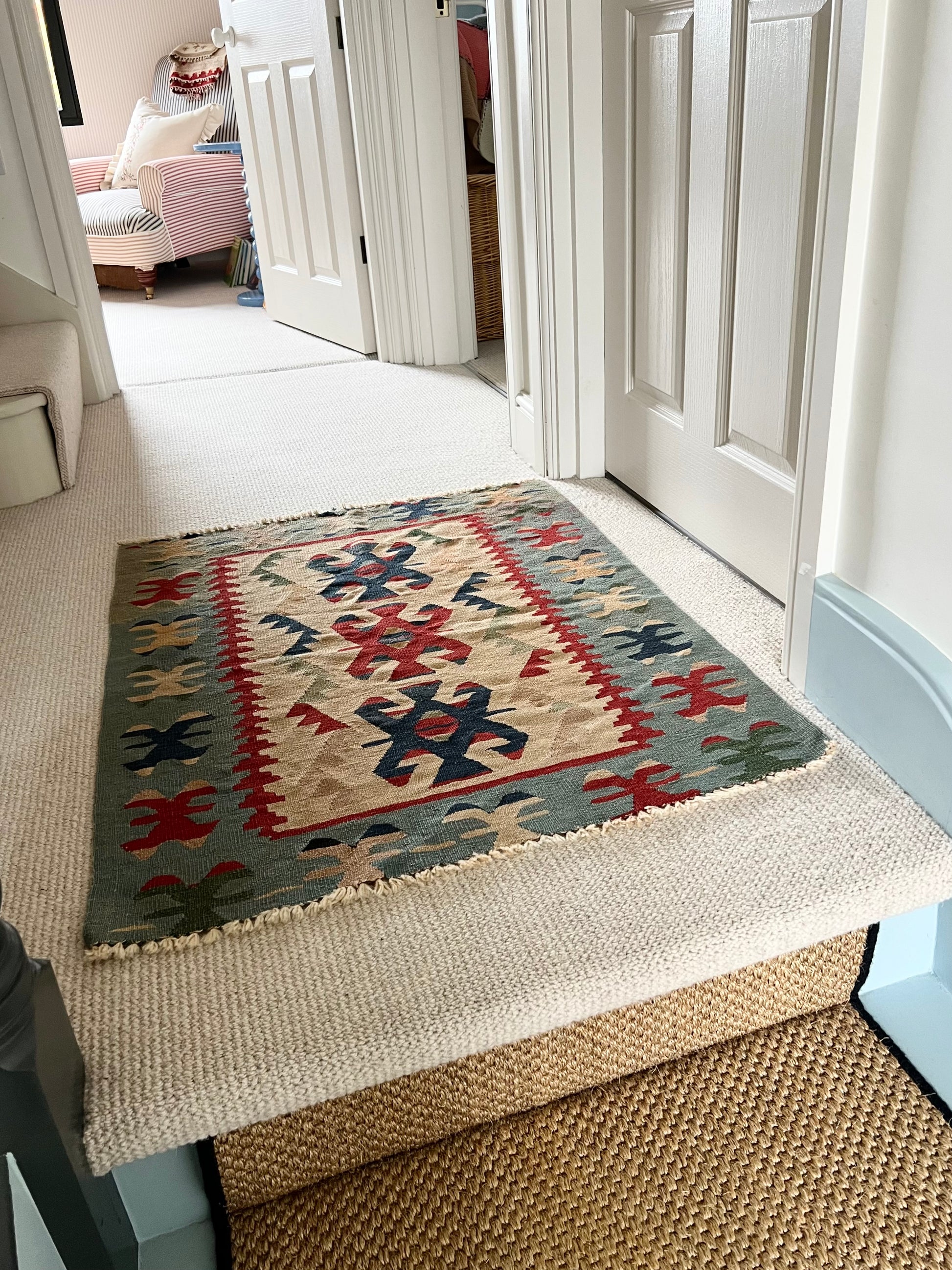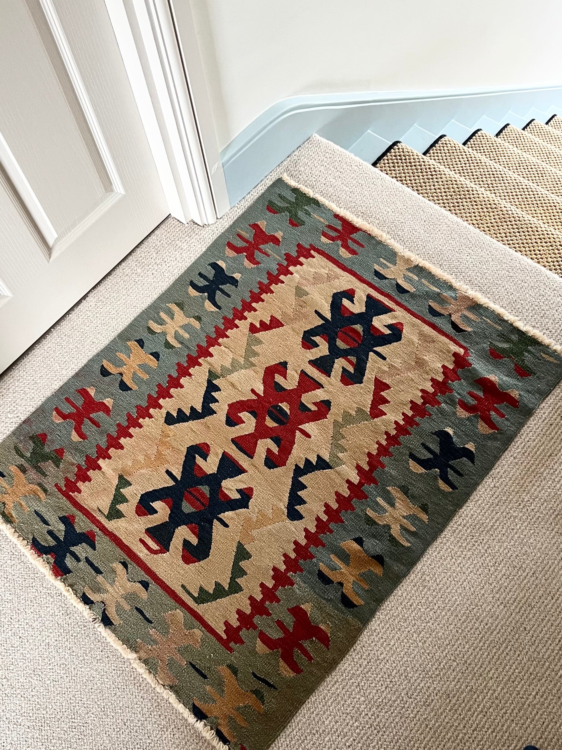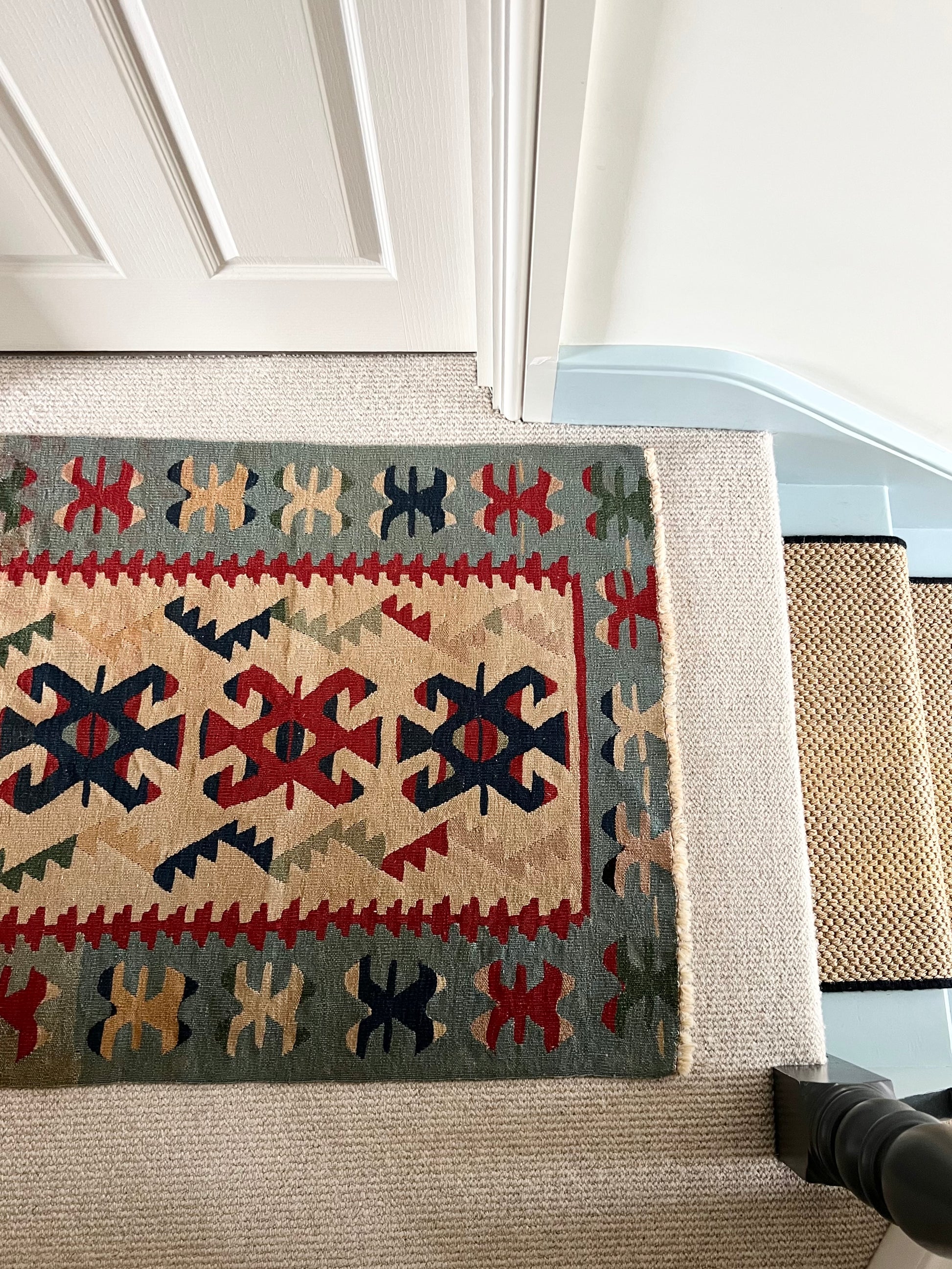 Handwoven in the Anatolian flat-weave tradition, it’s a compact yet striking piece—perfect for adding a dash of tribal charm to a hallway, stair landing, bathroom or cozy corner.