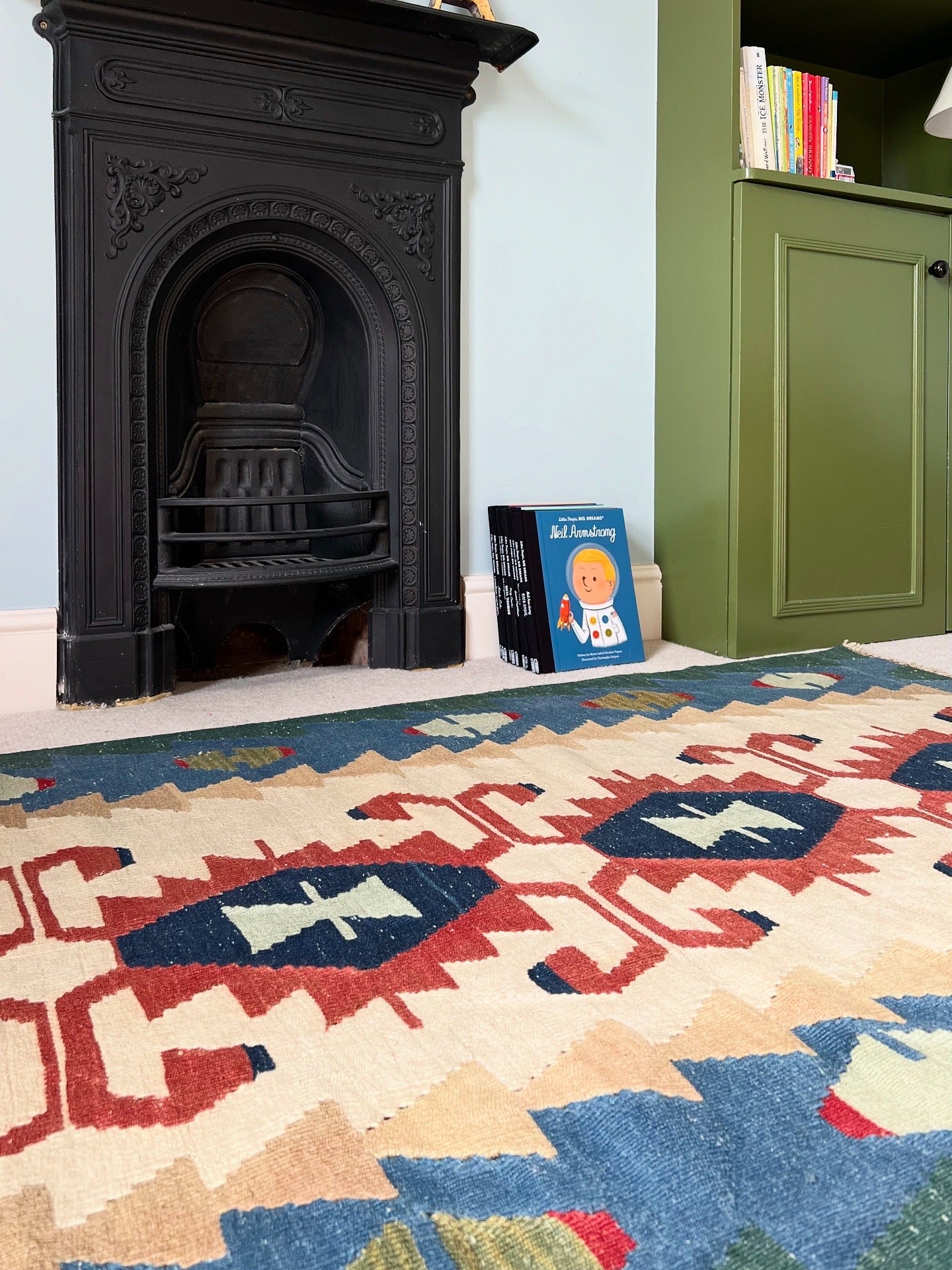 Milo has deep indigo diamonds, brick-red hooks and soft sandy tones, all framed by bands of blue and green. The pattern has that lovely rhythmic symmetry Anatolian kilims are so well known for, and the colours feel both playful and grounding. Perfect for anywhere you want a hit of personality.