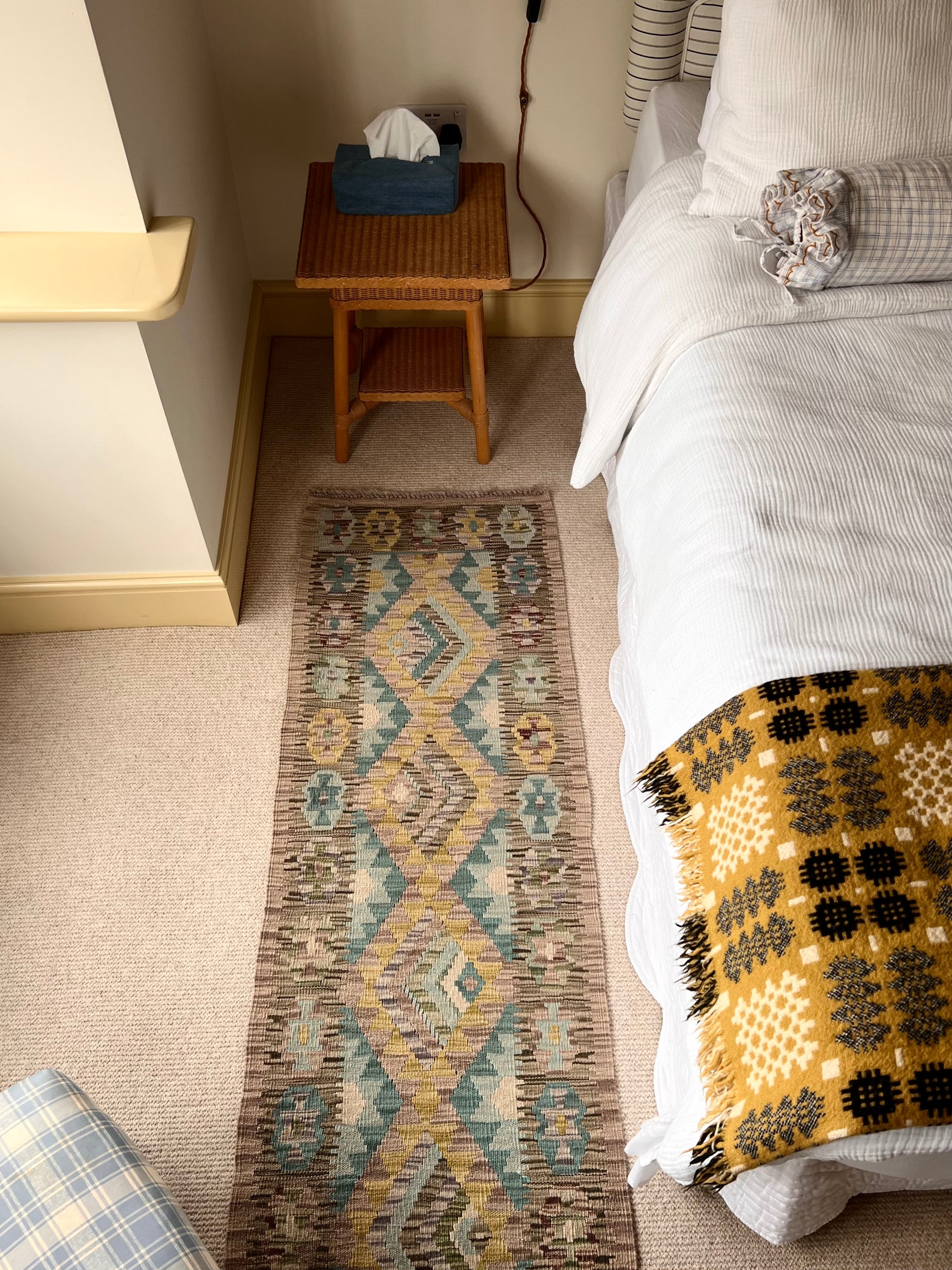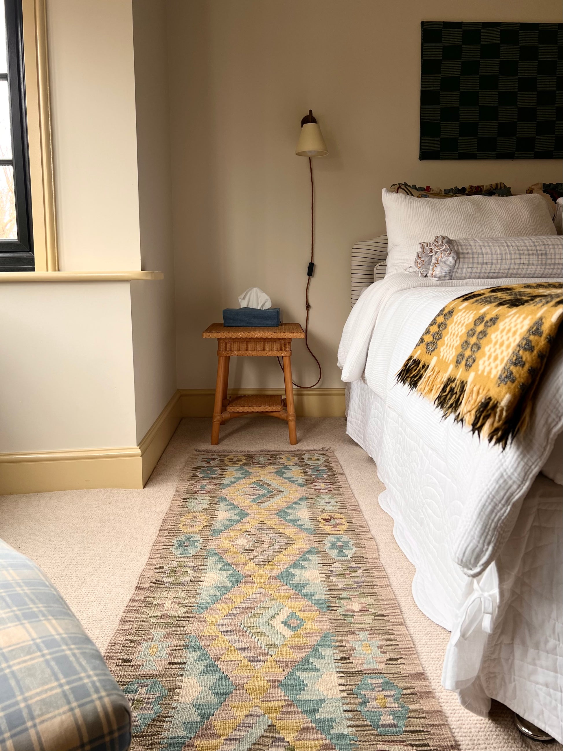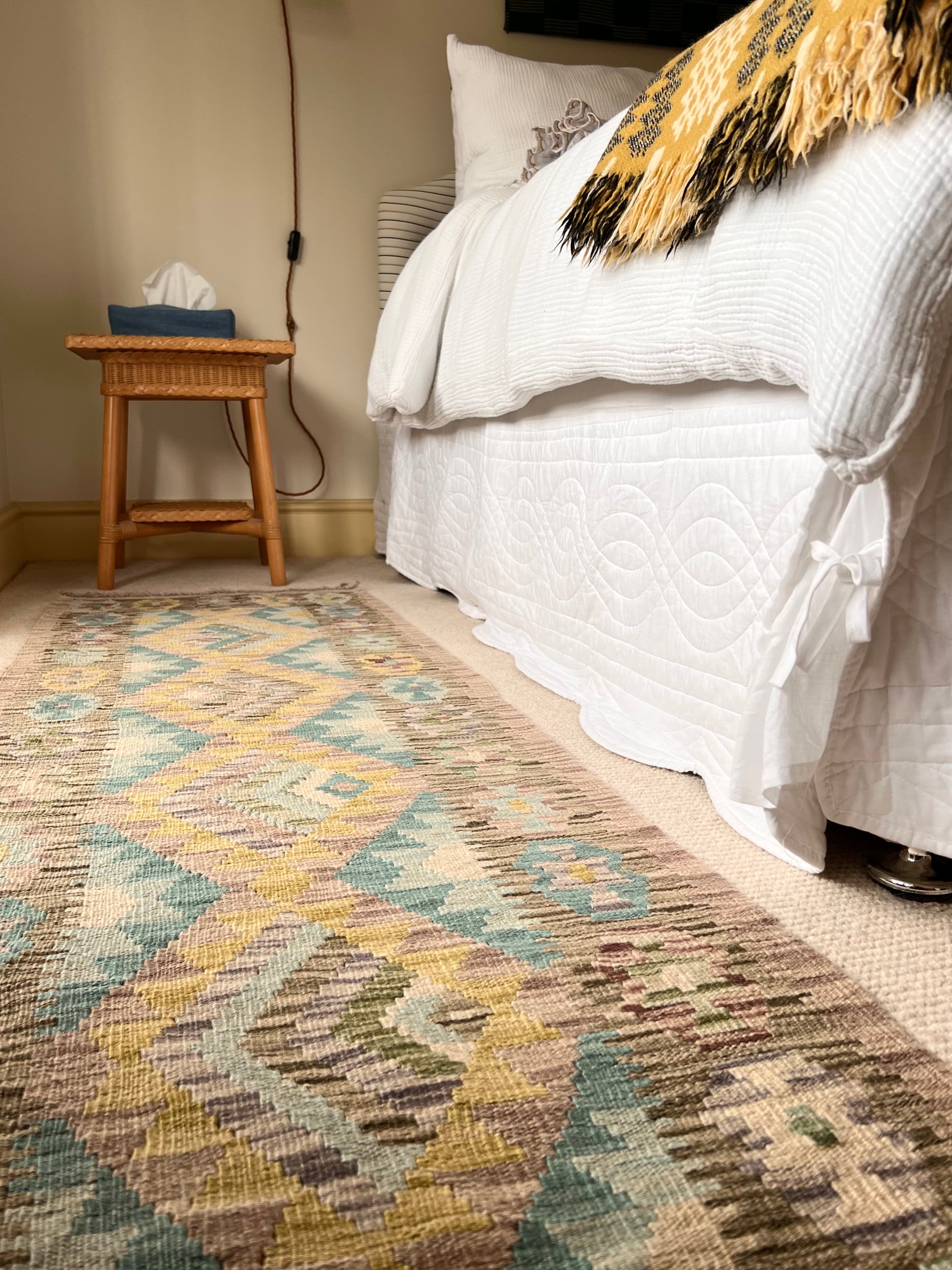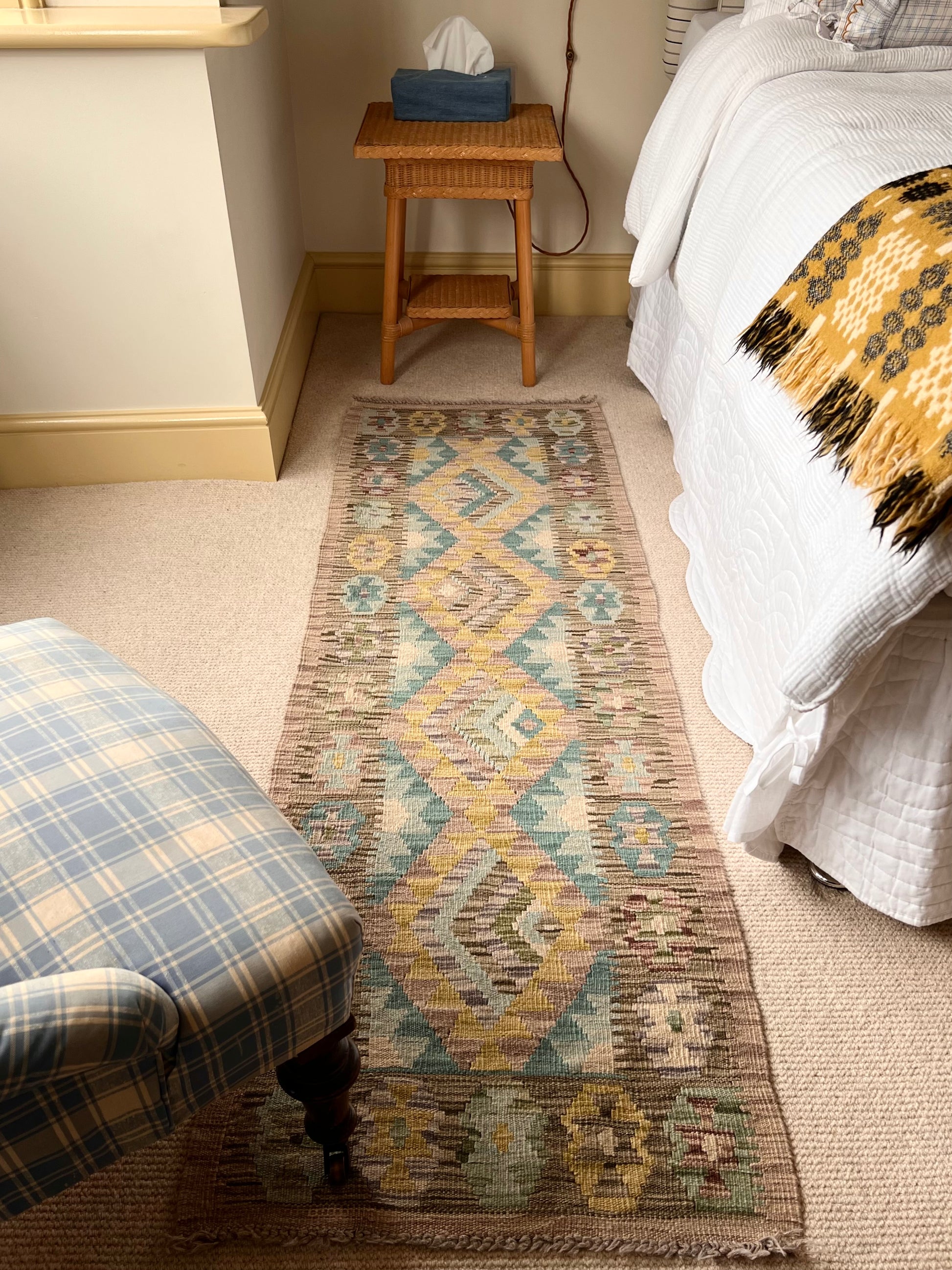 A softly faded vintage kilim runner in the prettiest washed blues, buttery yellows and gentle lilacs. The repeating diamond design gives it structure, while the timeworn palette keeps it feeling light and easy.