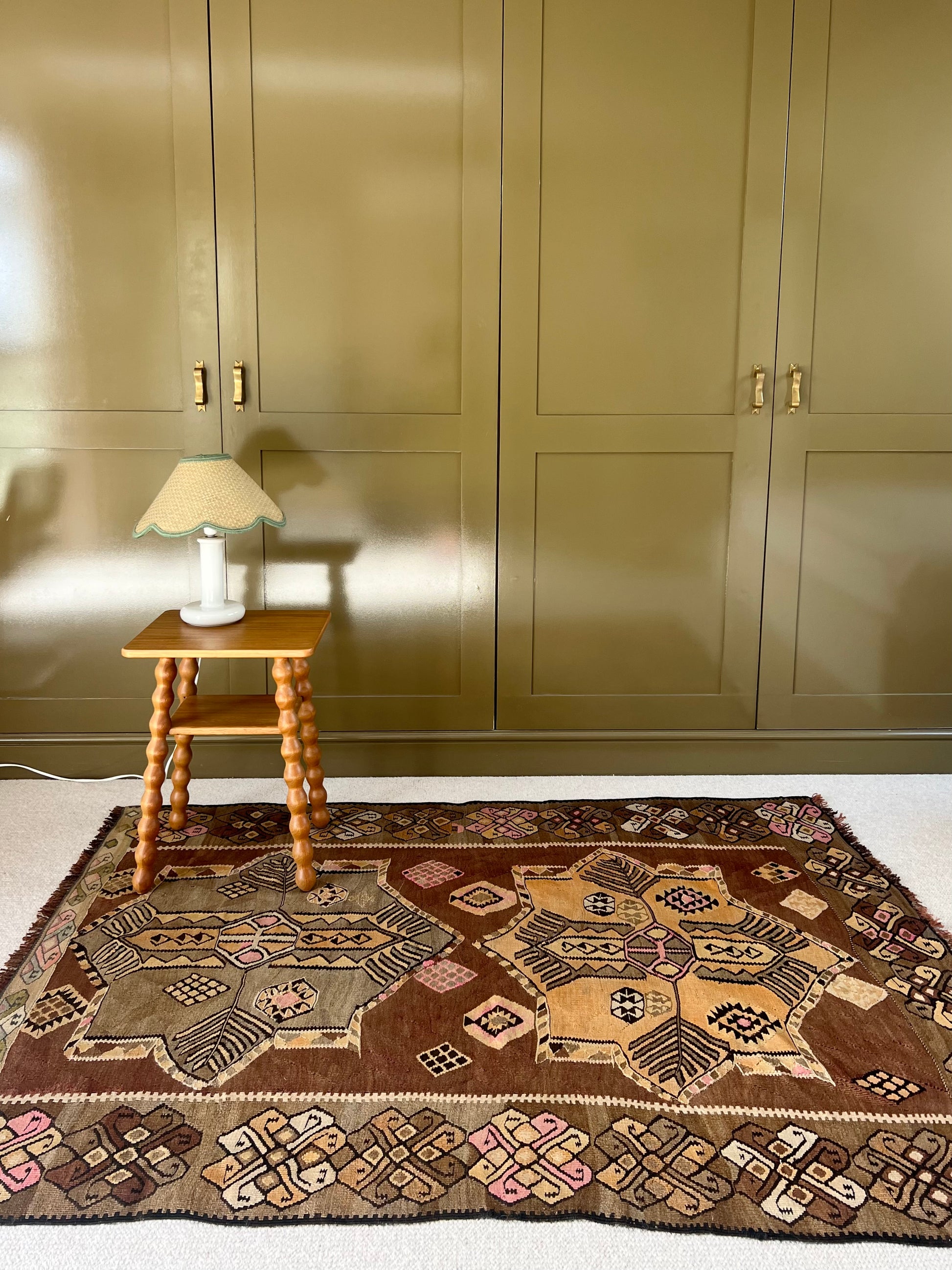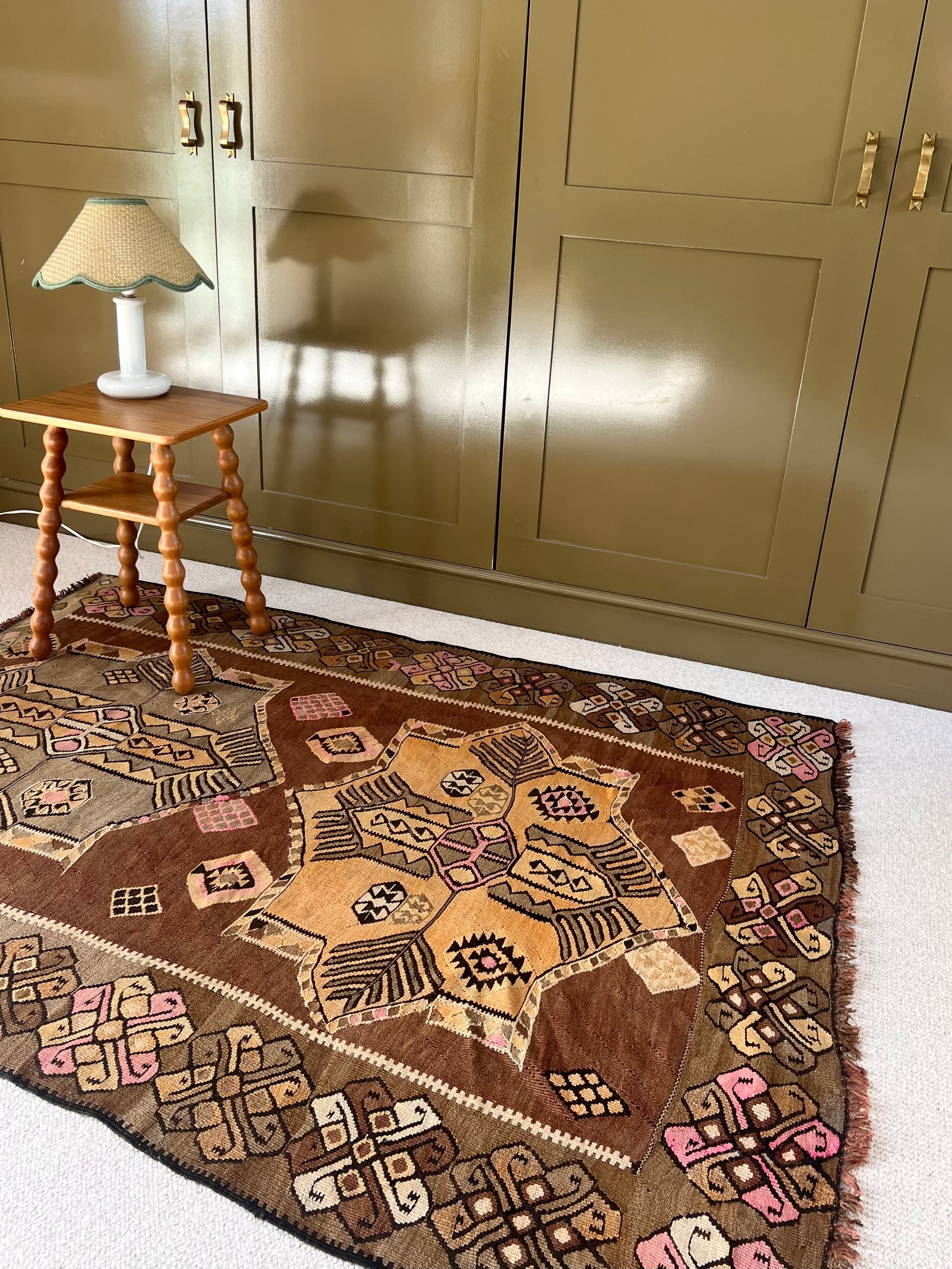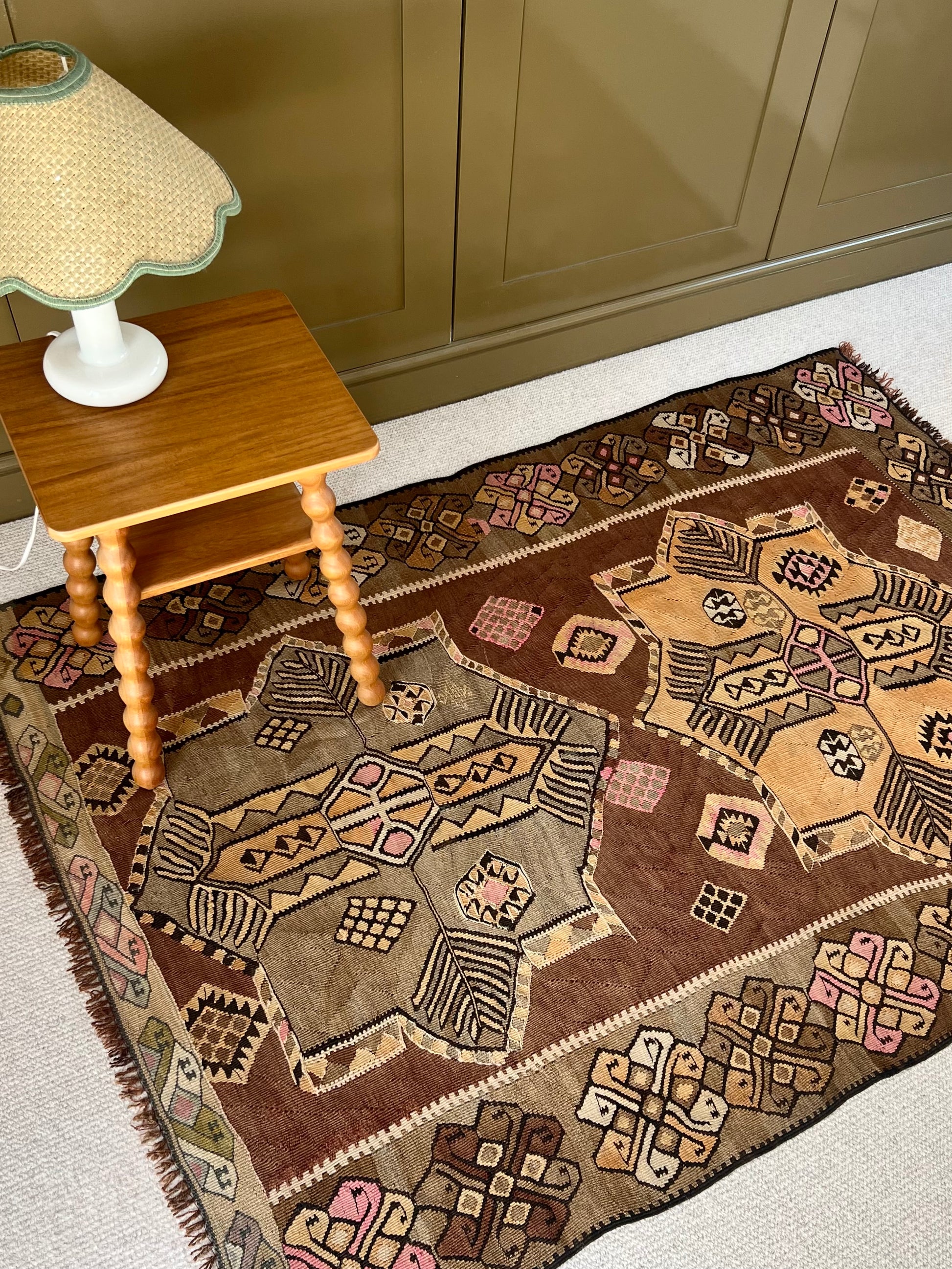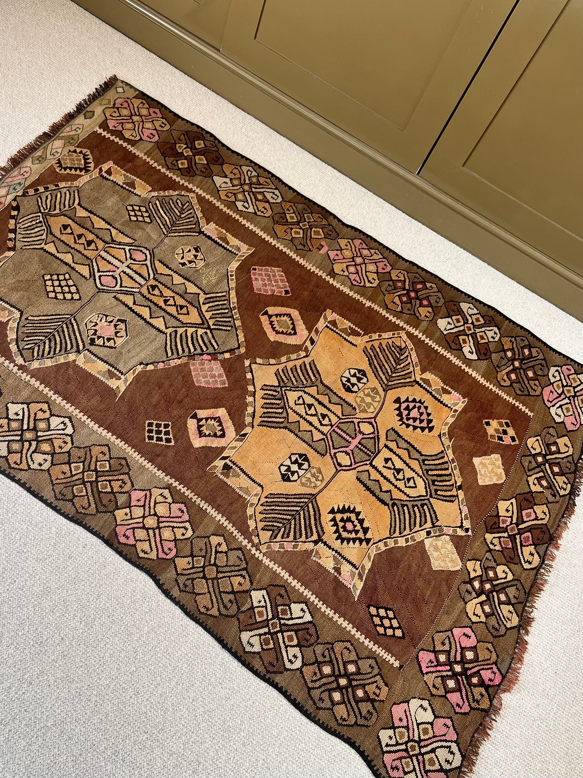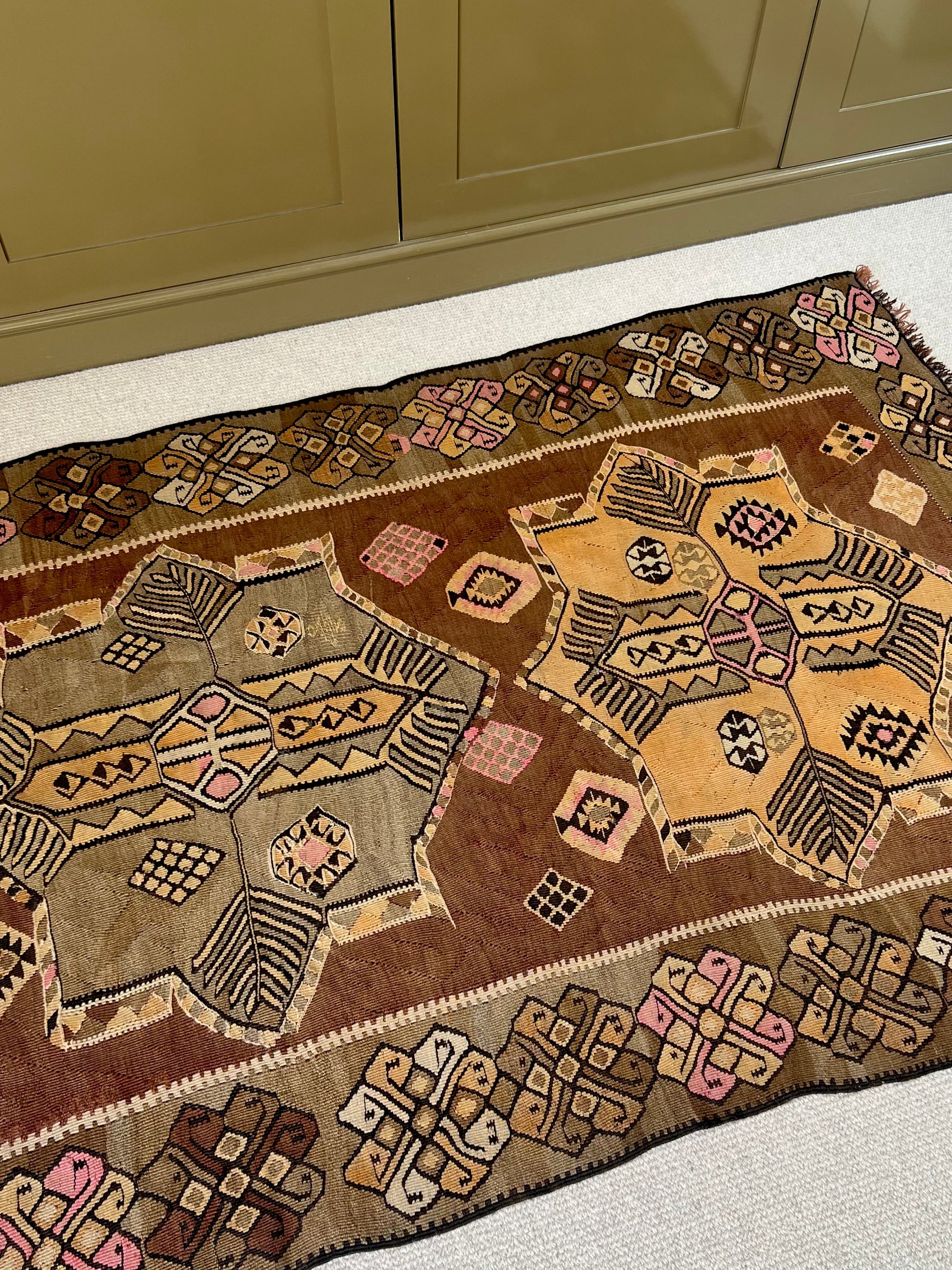 This vintage Kilim rug has a wonderfully earthy palette of browns, ochres, and soft pinks, with bold central medallions and a striking geometric border.