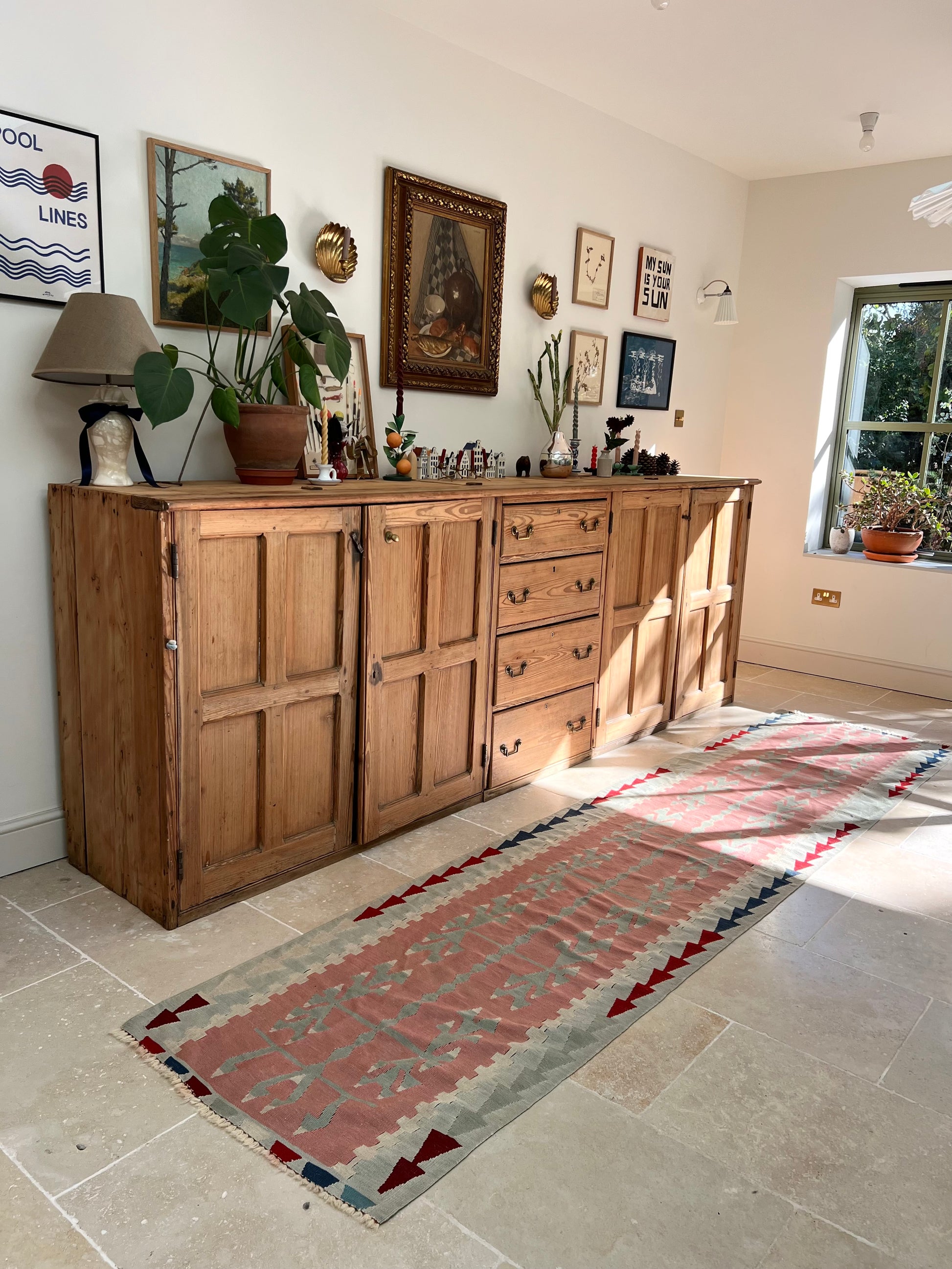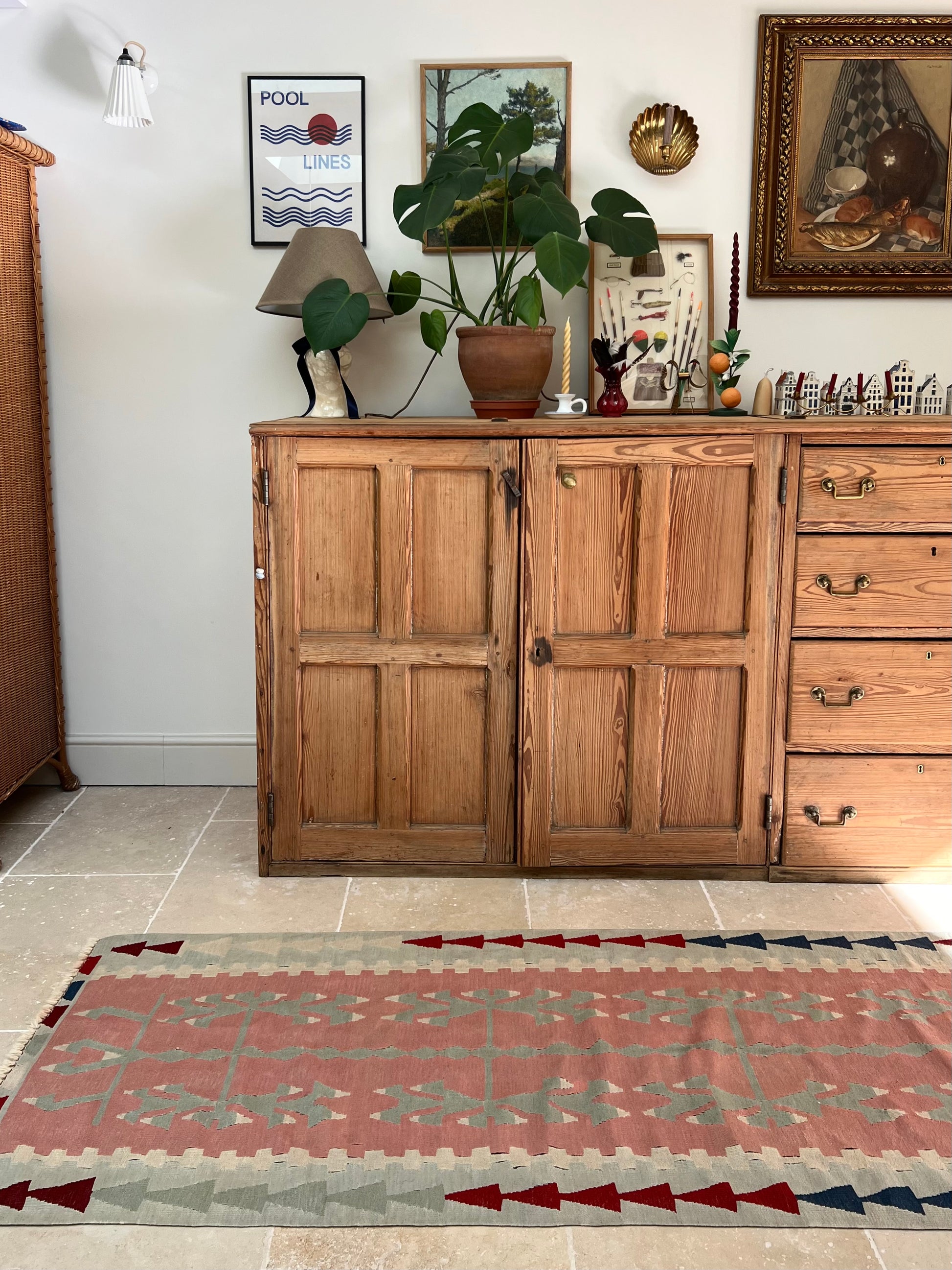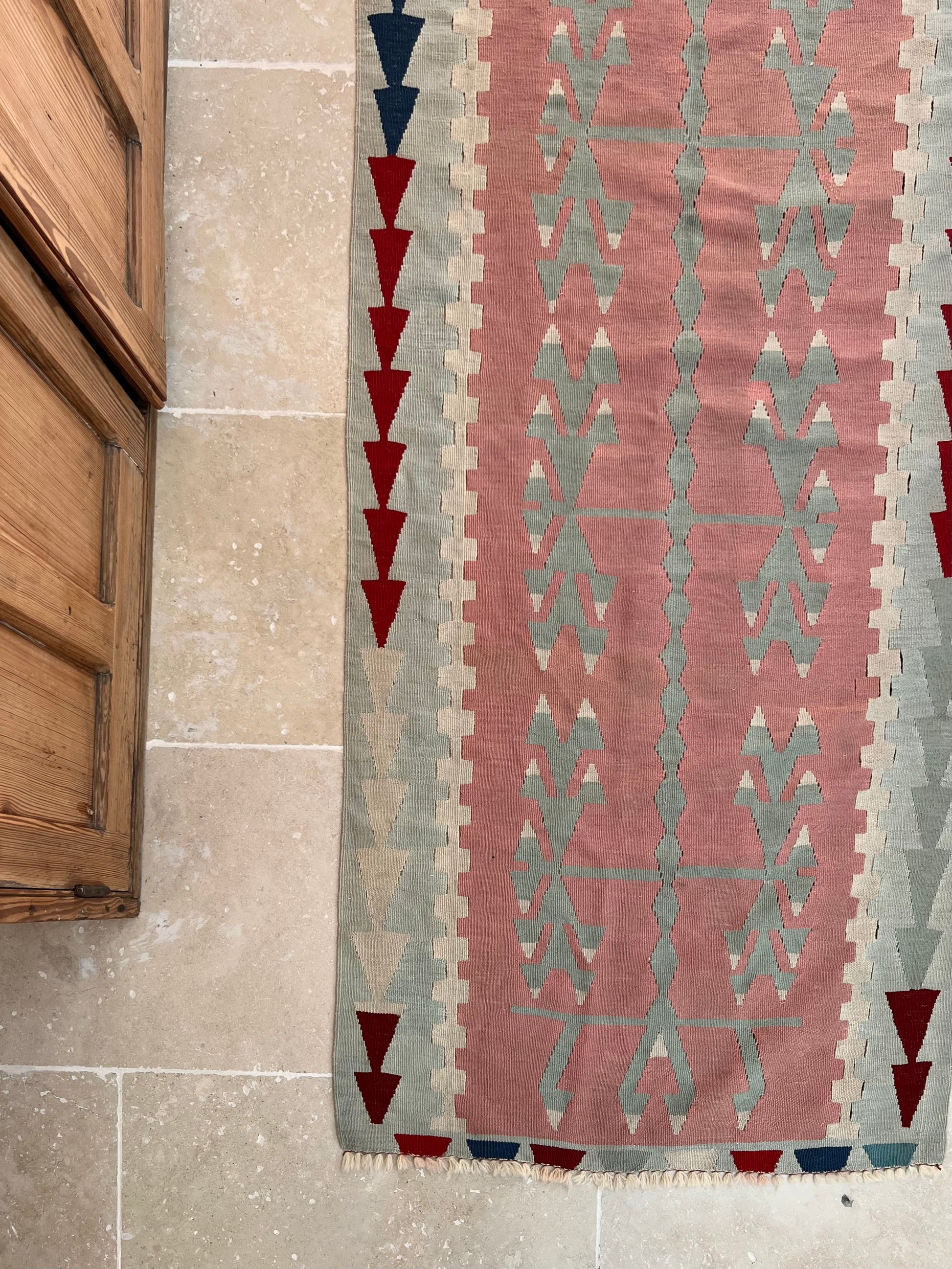 This vintage Kilim runner is full of charm, plaster-pink at its centre, flanked by light blue edges and bold red arrow motifs at each end.