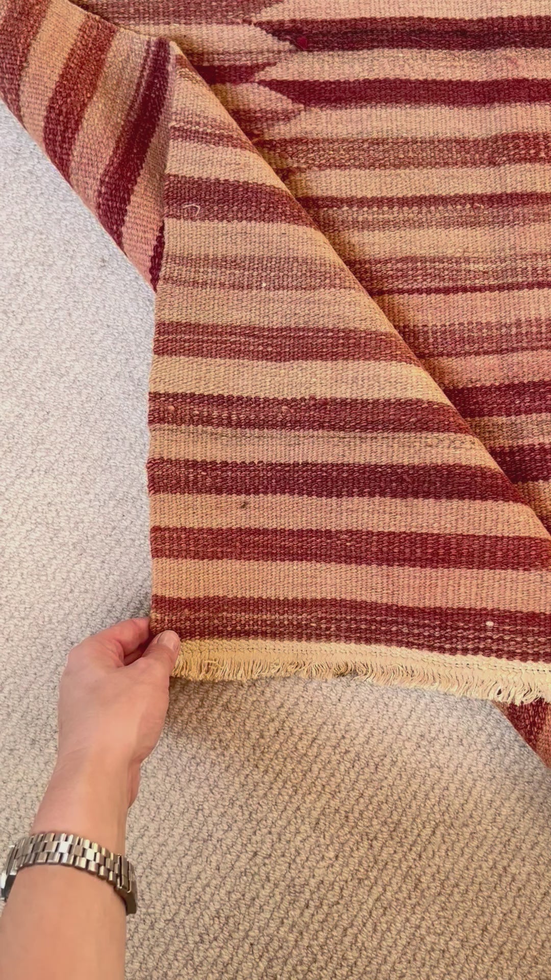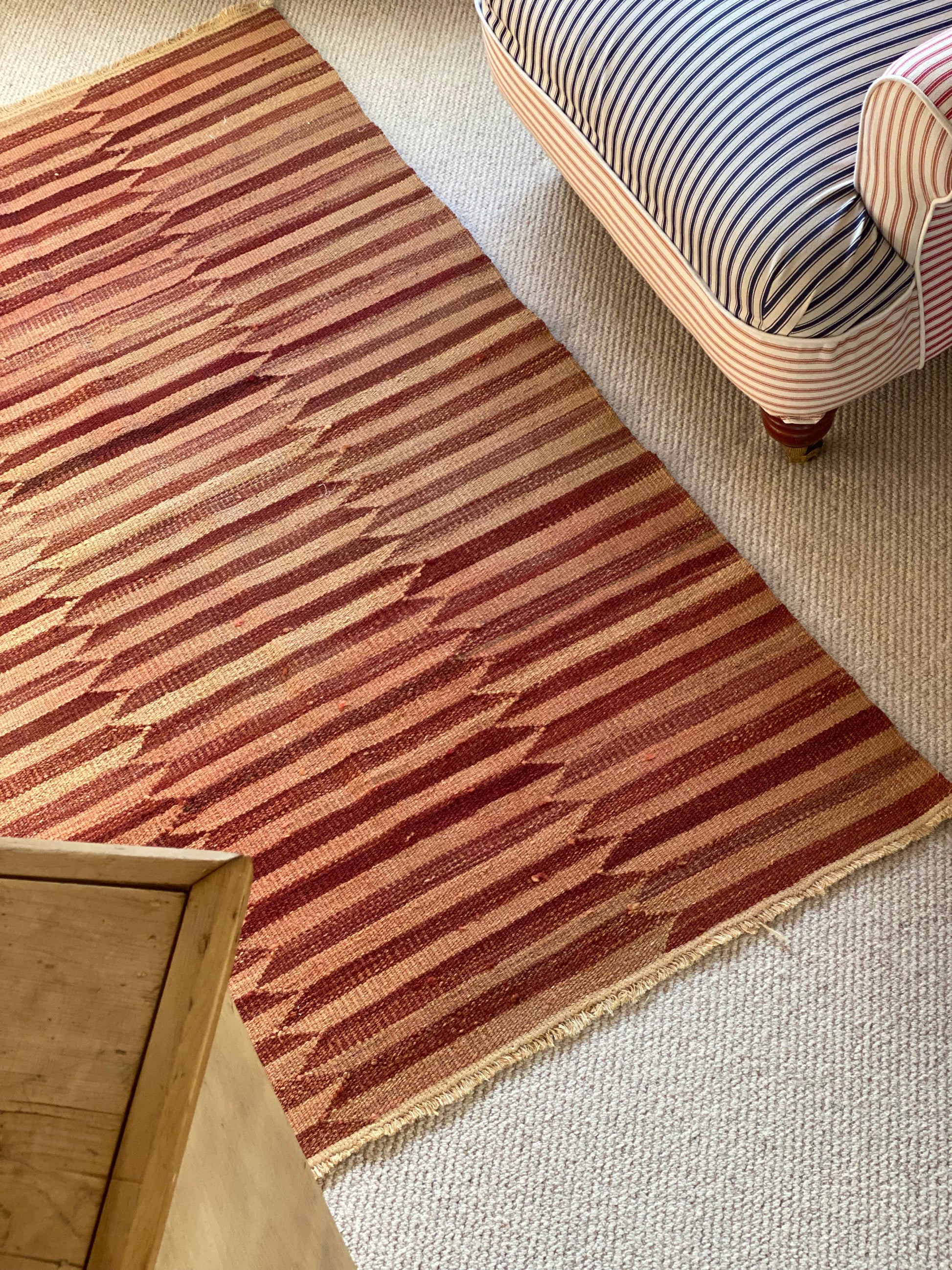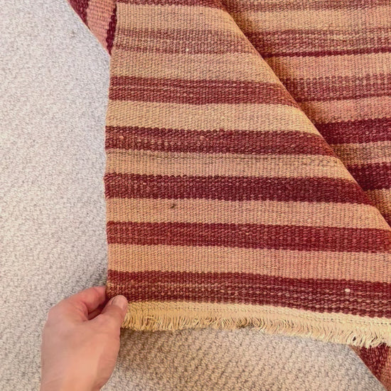 Bold dusty rose and peach geometric stripes adorn this vibrant piece. With beautifully irregular shading running throughout, creating a unique vintage version of a modern popular style. This rug will create a bold statement in any space, with a feminine edge and an authentic vintage feel.