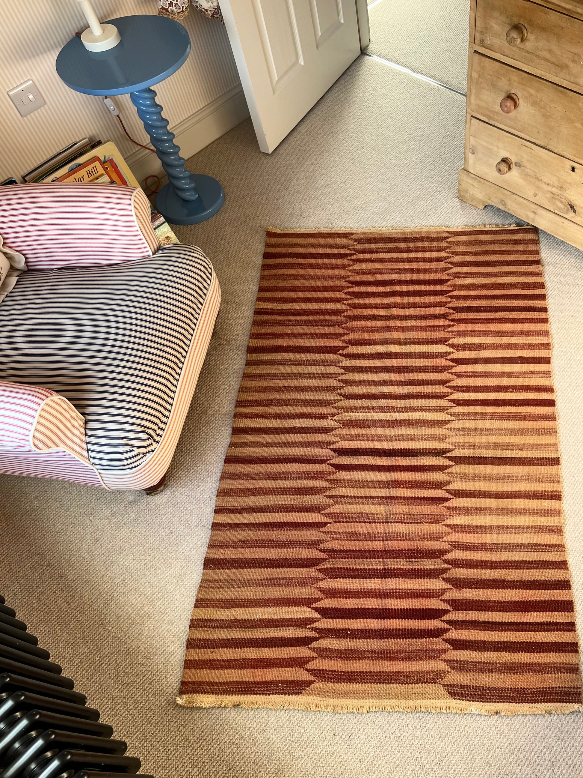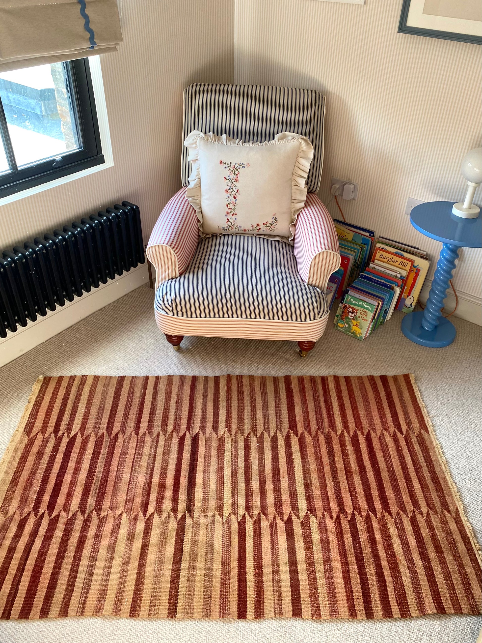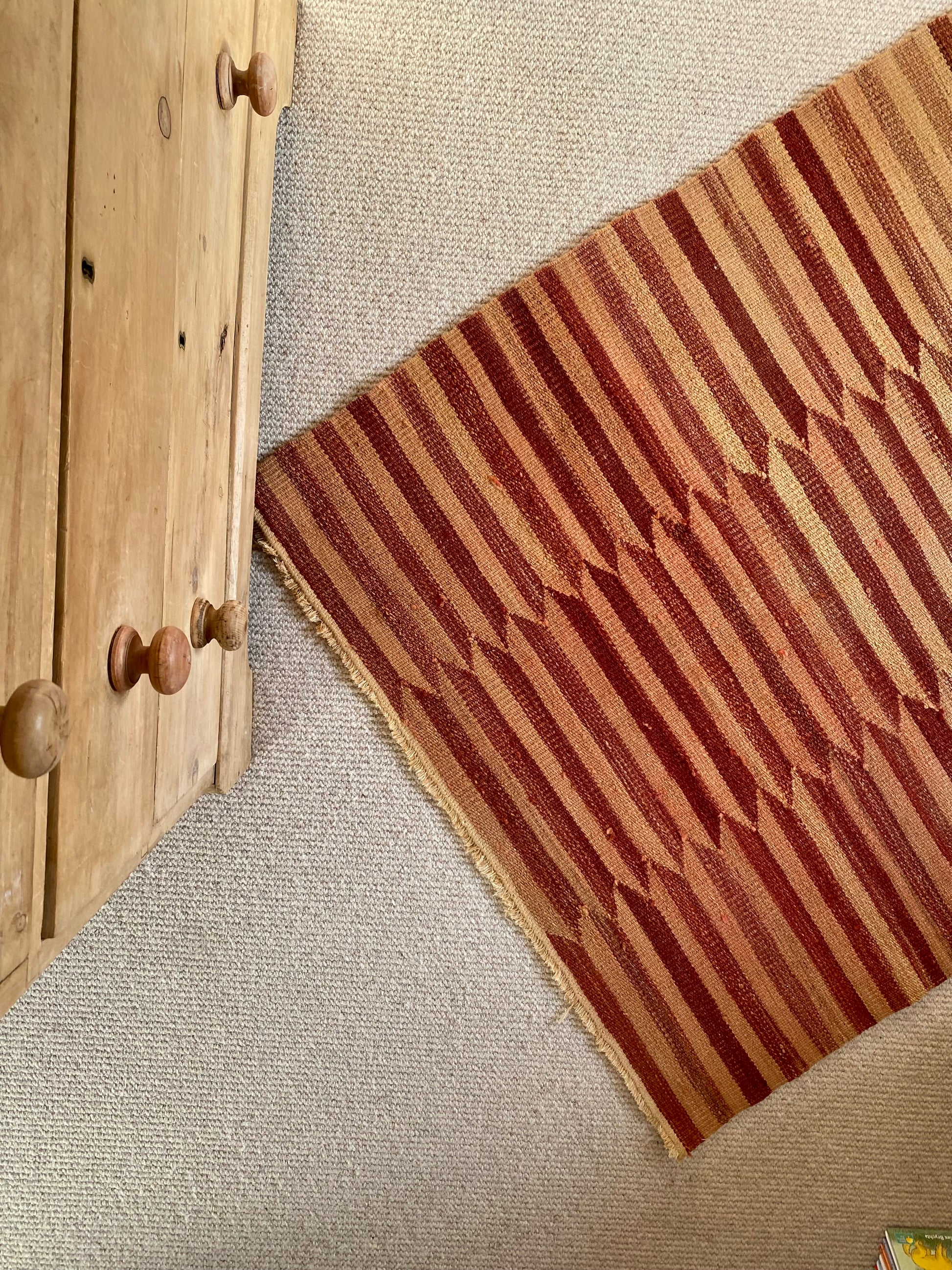 Bold dusty rose and peach geometric stripes adorn this vibrant piece. With beautifully irregular shading running throughout, creating a unique vintage version of a modern popular style. This rug will create a bold statement in any space, with a feminine edge and an authentic vintage feel.